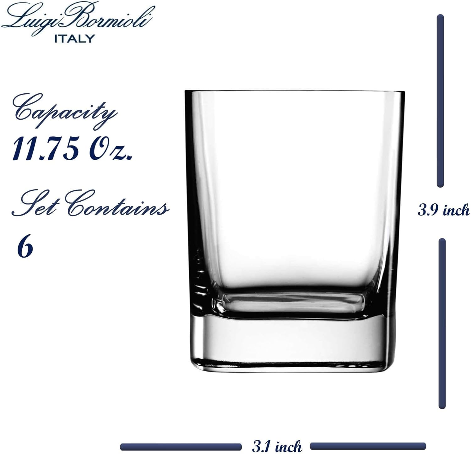 Add bold elegance to your home bar with the Luigi Bormioli Strauss Double Old Fashioned Glasses. This set of 6 brings a distinctive edge to your glassware collection, featuring a modern square shape that combines form and function. Crafted in Italy from advanced SON.hyx crystal, these glasses offer break resistance, exceptional transparency, and long-lasting durability. Each 11.75 oz glass is designed with a thick base to improve grip and stability, while the fine laser-cut rim delivers a smooth drinking experience every time. Whether you're serving up bourbon on the rocks, mixing a citrusy cocktail, or simply pouring a glass of water, these old fashioned cocktail glasses are made to suit every sip. Their bold silhouette enhances any table or bar display, adding visual interest without overcomplicating your setup. These multi-purpose drinking glasses are as functional as they are stylish. Built for daily use, they're dishwasher safe and retain clarity after repeated washes. The Strauss collection brings a modern edge to traditional whiskey glassware, offering clean lines, comfortable handling, and exceptional quality in every pour.
