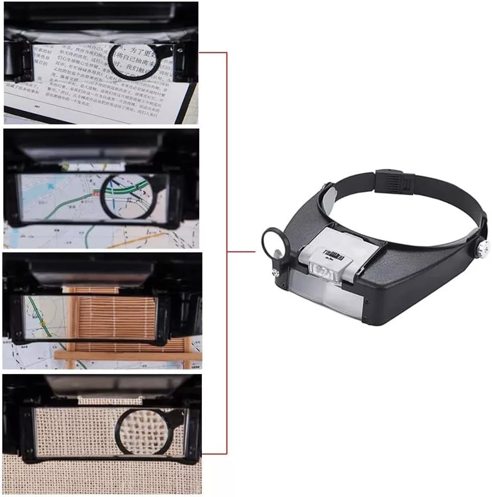 Product description:Hands-free head-worn magnifier, adjustable for a secure fit on the , capable of lifting the entire frontal normal vision without removing and installing the lensThree lenses can be combined and overlapped to provide 4 different magnifications: 1.5x, 3x, 8.5x, 10x with clear distortionBandana and face shield can be adjusted at an angle for more flexible wearingNon-detachable lens design to prevent lens lossSuitable for close work, widely used in reading, engraving, electronic repair, painting, sewing, small model making, etc.Product parametersMain material: ABS + acrylic lensLighting: 2 ledsBatteries: 2 AAA batteries (not included)Lenses: 2×1.5x acrylic bi-optic glasses lenses+7x auxiliary monocular glass lenses.Package Included:1 x magnifying glass (other demo products not included)Notice:1. Due to manual measurement, please allow 2-3% error.2. Due to different monitors, the color may be different, please understand.Experience highdefinition viewing and the convenience of a rechargeable battery with this compact microscope Magnifying Glass