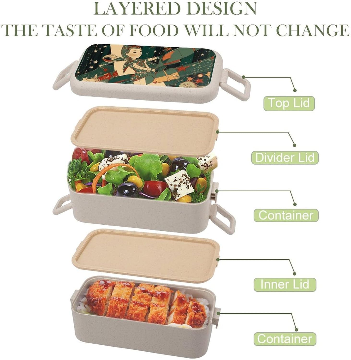 Fruit lunch box The food container is made of selected wheat fiber material,which will not emit other odors due to high temperature.It is a good helper for your daily life.The Space Series Collage printed food container adopts a partition design,which can separate different types of food,maintain the original flavor of the food,and plan your meal time reasonably.Integrated lunch box Small size and light texture,it will not feel bulky when put in a handbag or backpack during commuting.Portable lunch box The sealed design can reduce the possibility of accidental food spillage and odor escape,providing convenience for your dining.Travel snack box In addition to accommodating staple foods and side dishes,the large capacity can also be used to place other foods such as fruits and vegetables.Bento box set Washable and reusable.