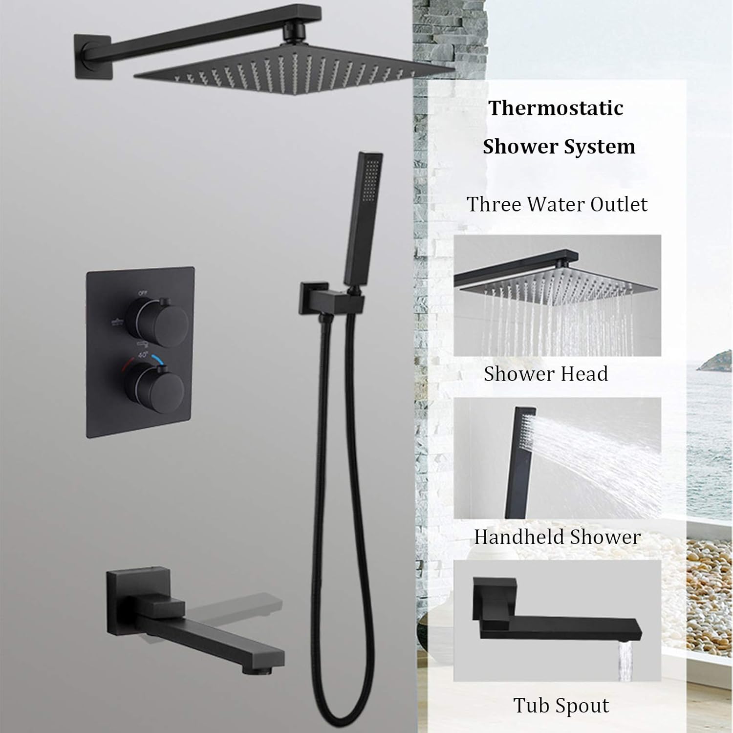 Specification:Style: ContemporaryFaucet Type: Shower SystemInstallation Way: Wall MountedFeature: Thermostatic Cold/Hot Water Control Type: Automatic thermostat control3 Function Water Outlet: Rainfall shower head, handheld shower, swivel bathtub faucetBath & Shower Faucet Type: Concealed Shower FaucetsColor: BlackShower Head Size: 12 InchesMaterial:Valve Core Material: CeramicShower Head Material: Stainless SteelHandheld Shower Material: BrassTub Spout Material: BrassShower Valve Material: BrassWarm Reminder:★ Manual measurement of various sizes has a certain error. Please refer to the actual product!★ The project may be slightly different from the picture due to the display of lights and displays.About us: Our shop focuses on selling shower systems, bathtub faucets, basin faucets, handheld showers, floor drains and other products used in bathrooms. Our aim is to provide you with a perfect shower experience, let you enjoy a good life in your own bathroom, eliminate the fatigue of the day, and welcome a better tomorrow. If you have any questions, please feel free to contact us via email, we will reply to your information within 24 hours