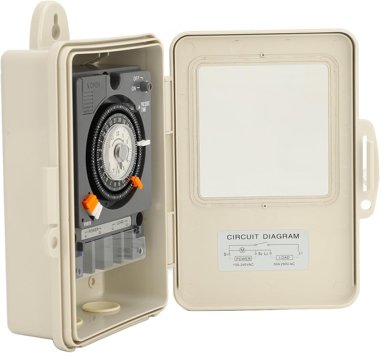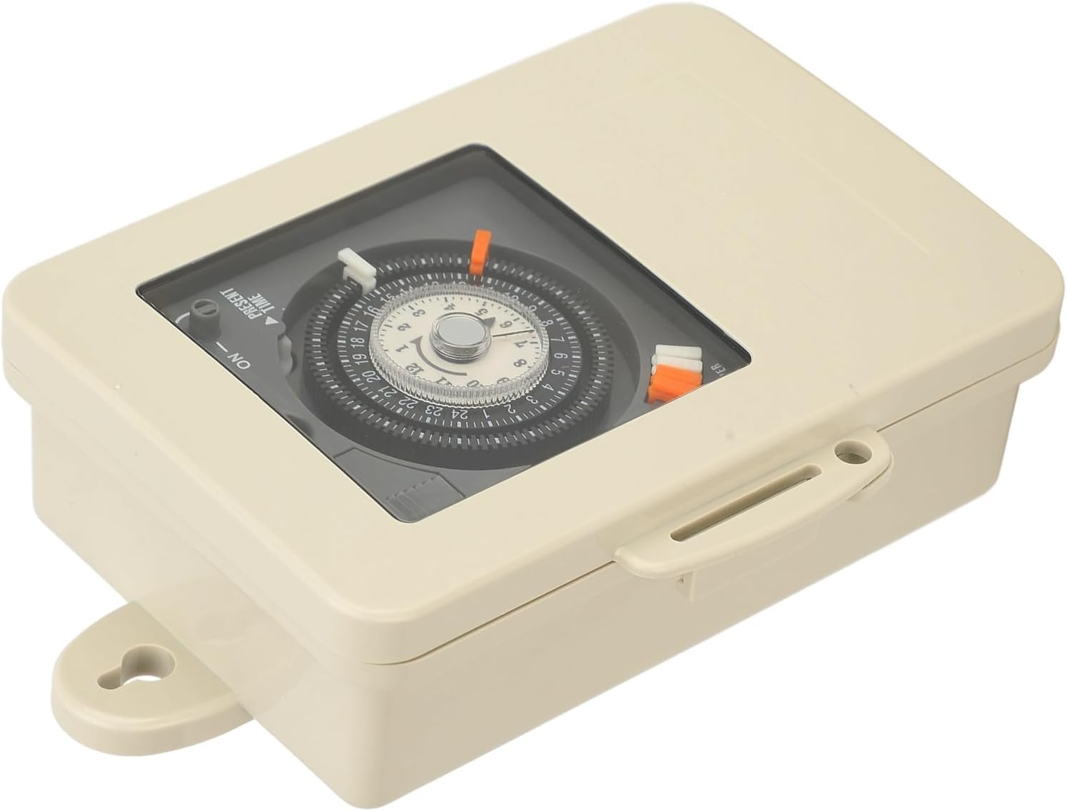 1. Accurate Timing Function: This mechanical box timer switch has an accurate timing function to ensure that the connected circuits start and shut down on time, which is and . 2. Built In 80mAh Lithium Battery: This mechanical lighting and appliance timer has a built in 80mAh lithium battery, without the need for external power supply, easy to carry and install. 3. Simple Interface: This mechanical appliance timer adopts a simple and easy to use interface, which is convenient and quick to operate without any complicated . 4. Sturdy And Endurable: The Cover of this mechanical timer is made of excellent plastic and the same material, which is sturdy, abrasion and erosion , and can guard the electrical components from being damaged easily in the long term. 5. Wide Application: This mechanical time switch has a wide range of applications and can be used for agricultural irrigation, garage door control, lighting control, factories, workshops and so on. Spec: Item Type: Mechanical Timer Material: Plastic, Copper Operating Voltage: 100-240V Battery Type: 2.4V Lithium Battery x 1 (80mAh Capacity Battery Included) Power: 110V 1500W, 220V 3000W 96 Switch Segments Quartz Control Shortest Switch Time: 15 Minutes Voltage Withstand: 85-264VAC Frequency: 50, 60HZ (Commonly Used) Power Consumption: 110VAC: 1W, 220VAC: 2W Drive Method: Quartz Control Current Frequency Cycle: 24 Hours Circuit: Independent Circuit (No voltage applied to load circuit) Switch Structure: SPST Load Manual ON or OFF: ON, AUTO, OFF Maximum Current: 30A Proof Level: IP53 Current Time Setting: Rotate the minute control knob of the central clock. ON and OFF Program Setting: 15 Minutes Minimum Unit: 15 Minutes Shortest Interval: 15 Minutes Current Time Setting: Rotate the minute control knob of the central time to set ON and OFF Frequency: 96 Times (48 Times On, 48 Times Off) With full battery, continuous power supply for 3 days, can compensate for power outage for 30 hours. Frequent power outages and long interruptions will shorten the battery life. How to Use: 1. Use the yellow fork placement to determine the opening position and the white fork placement to determine the closing position (time is displayed according to the outer , with three yellow forks and three white forks). 2. The time inside the circle represents the current time in your area, and can only be adjusted clockwise. The dial is divided into AM and PM, be careful not to mix them up. 3. Turn the manual switch in the direction of the to the right to open or close the load. 4. If the load circuit is in the ON or OFF state for a long time, remove all time setting pins before operating the manual switch. Do not turn the manual switch when the time setting needle is within 1 hour of the current time. 5. When setting the time, do not turn the minute hand in the opposite direction. If you forcefully turn it in the opposite direction or directly turn the dial, it may damage the dial. When you purchase this switch, the built in battery may decrease in capacity due to self discharge. If it is completely discharged, even if you turn on the power, the clock will not work. In this Box/Cover, it requires 2‑3 minutes of charging time, then set the current time. Wiring Method: Pay attention to matching the positive and negative poles of the load with the zero line and fire line. 1. Applicable cable: IV twisted pair cable (2.5‑3.5mm) 2. Strip length of actual size 14mm 3. Tighten the terminal cover after wiring. PackageList: 1 x Mechanical Timer 1 x Battery 2 x Manuals