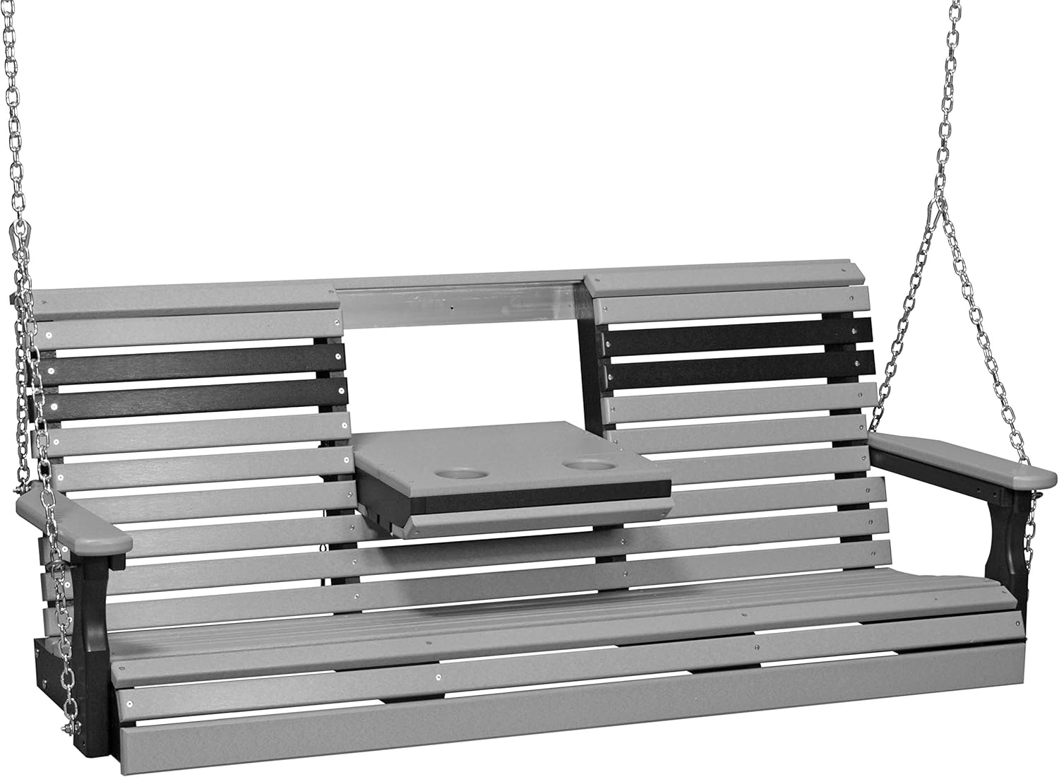 Enjoy what Mother Nature has to offer with this simple, yet elegant porch swing. Stainless steel chain is included to hang your swing from porch or A-Frame swing stand. May it become a central part of your outdoor living space. Sit back, relax and set your drinks and snacks aside on the convenient center drop-down console with built-in cup holders. Use the locking pin to secure your console when not in use. Contoured seat with rounded edge, and arm rests for optimum comfort. Seats up to three people, or two when center console is in use. --- Dimensions - Overall: 64.5"W × 26"D × 24.5"H, Seat: 60"W x 18"D, Weight: 85 lbs. Assembly is required, however, thourough instructions are included for easy assembly. --- Made from poly lumber (HDPE) a plastic made from post-consumer recycled waste like milk jugs and laundry bottles. This plastic is melted and pressed into dense boards that can be used as a building material, such as outdoor furniture. Our poly is 90% recycled plastic by weight, so you can feel good about your poly furniture. Poly is also exceptionally resistant to splintering, warping, moisture and many other environmental factors. Built with UV stabilized pigments to minimize fading through sun and weather exposure. --- LuxCraft products are backed by a limited lifetime residential warranty, and a 5-year limited commercial warranty. Defective and non-conforming products or parts are replaced at no cost to you. Contact our sellers for more information.