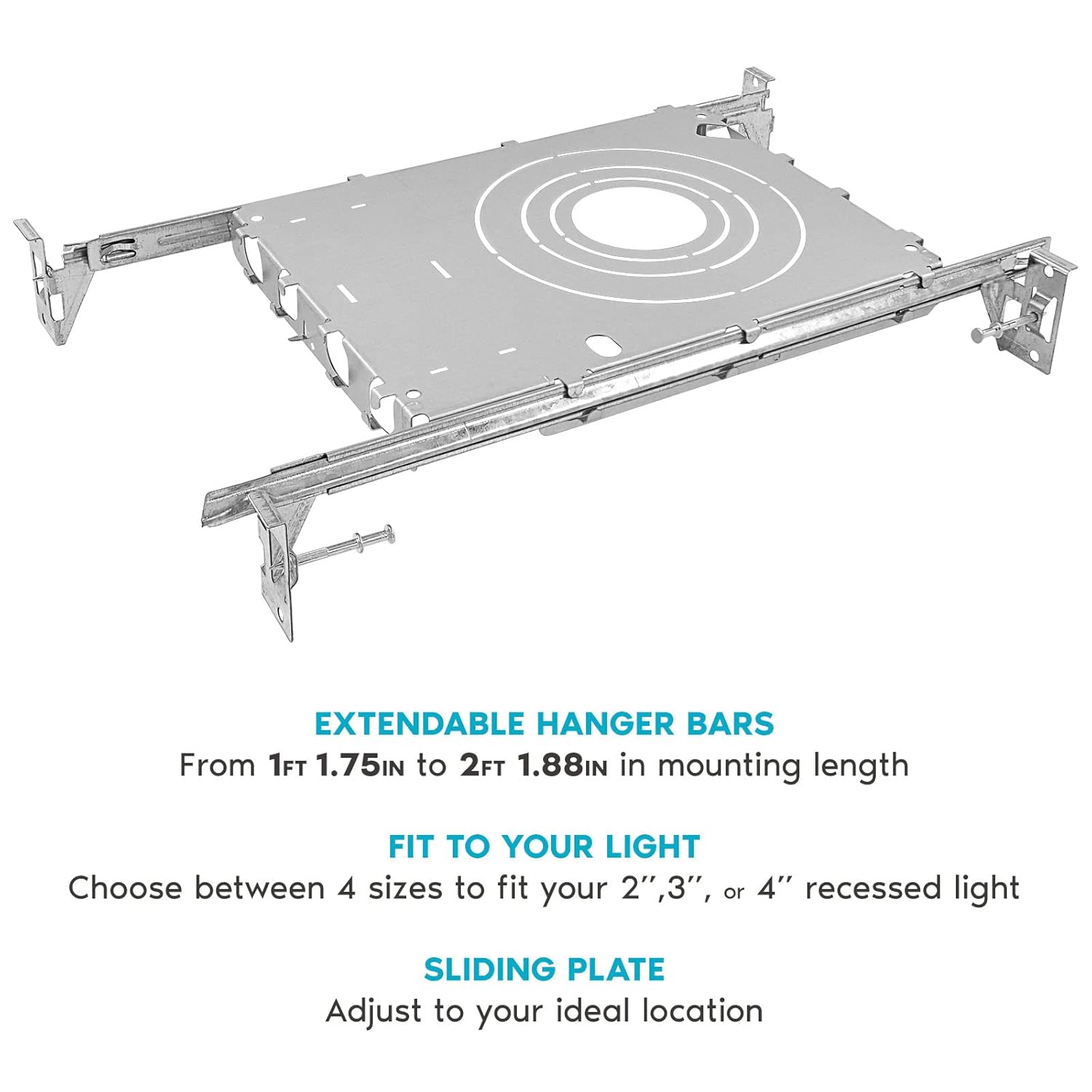 Luxrite New Construction Mounting Plate fits 2 Inch, 3 Inch, and 4 Inch LED recessed lighting kits and is the perfect choice for new construction homes or house remodeling. Great when paired with ultra thin or slim recessed lights with junction box. Each mounting plate comes with 2 hanger bars which can extend from 13.75 inches to 25.88 inches and a plate that can slide along the bars from end to end. Made of durable metal and so you can be sure that your recessed lighting is secure. Model #: LR41004