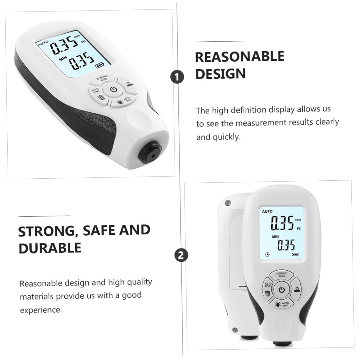 Package List 3 x thickness gauge 3 x manual 3 x calibration sheet Characteristics -Material: ABS, electronics Mini Thickness Gauge. -Power supply: 2 x 1.5V AAA batteries (not included) Auto Paint Digital Meter. -Resolution: 0.01mm/1mil Gauge. -Color: White Car Paint Coating Tester. -Measuring range: 0-2000UM Car Paint Digital Meter. -Size: About 11.00X5.20X2.50cm/4.32X2.04X0.98in Mini Digital Thickness Gauge. -Operating : -10 ℃ - 50 ℃ Car Digital Thickness Gauge. -Measurement accuracy: ±(3%+1UM) Car Gauge. - The compact size and light weight design are convenient for US to store and carry Portable Thickness Gauge. - Mainly used to non-destructively measure the of car Auto Car Paint Tester. - Made of plastic ABS and electronics material, it is strong, safe and Digital Thickness Gauge. - The high-definition display allows US to see the measurement results clearly and quickly Auto Paint Coating Tester. - Reasonable design and materials provide US with a experience .Goods DescriptionAuto Car Paint Tester A very useful digital thickness gauge, measuring range is 0-2000UM.Auto Paint Digital Meter An tool for a broad range of industrial and automotive applications.Auto Paint Coating Tester The item is a digital display thickness measurement tool.Digital Thickness Gauge Suitable for measuring the thickness for the car paint coating