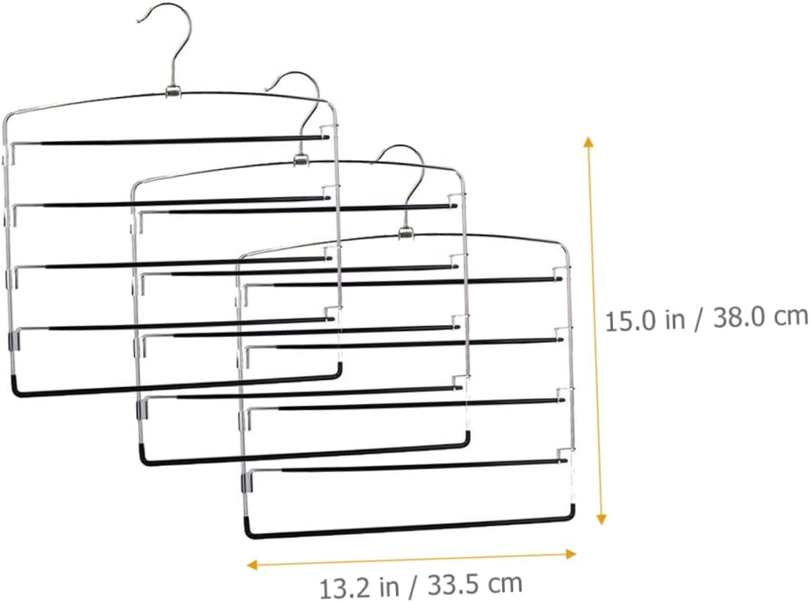 Package List 3 x 5-tier Skirt Hangers Features - Color: Black 5-tier Jeans Hangers. - Material: High manganese steel Pants Hangers. - Size: 3800X3350X050cm/1493X1317X020inch 5-tier Pants Hanging Hanger. - You can easily save time on dressing as you will be able to find your clothing faster and easier! Skirt Hangers - Fine workmanship and smooth surface and no burrs, and reliable, without hurting your hands 5-tier Jeans Hanging Hangers. - Easy to use anywhere, such as bathroom, bedroom, wardrobe, and will not easily fall off 5-tier Metal Pants Hangers. - Help you maximize your closet space while making it tidy and organized, can be used for home 5-tier Skirt Storage Hangers. - Manufactured with metal material which is and excellent, and strong, for long time use 5-tier Metal Skirt Hanger.Goods DescriptionSkirt Hangers Made of metal material, it's strong, and sturdy for hanging jeans, pants and skirt.5-tier Jeans Hangers You can also save time on dressing as you will be able to find your clothes faster and easier!.5-tier Jeans Hanging Hangers Simple style, 5-layer design, the skirt hanger is useful and reliable for home use.5-tier Skirt Storage Hangers Very beautiful and , it is indispensable household pants hanger