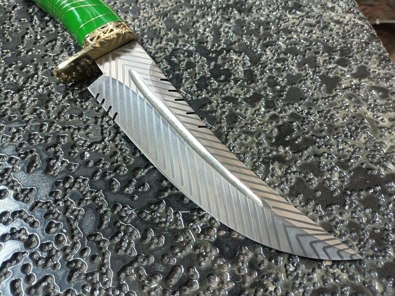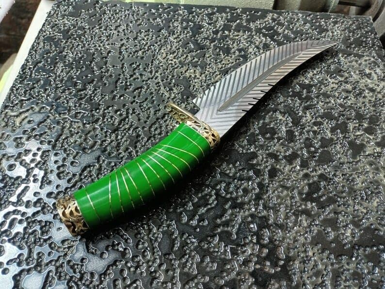 Introducing this exquisite hand-forged feather knife from Blade Frenzy, a masterpiece that seamlessly blends artistry with functionality. The striking blade features an intricate feather pattern damascus steel design, meticulously forged to create unique, flowing lines that catch the light beautifully. The ergonomic handle is crafted with a vibrant green resin material, complemented by elegant brass guard and pommel that add both style and balance. Perfect for hunting, camping, and bushcraft activities, this full-tang knife offers both reliability and aesthetic appeal. The carefully designed curved blade profile ensures efficient cutting performance, while the premium materials guarantee lasting durability. Each knife showcases exceptional craftsmanship, making it an ideal display piece when not in use. Whether you're an outdoor enthusiast or a collector of fine cutlery, this distinctive knife serves as both a practical tool and a conversation starter. A thoughtful gift choice for those who appreciate both form and function in their outdoor gear.