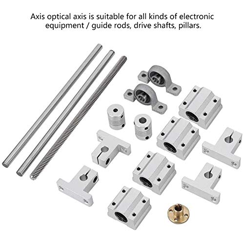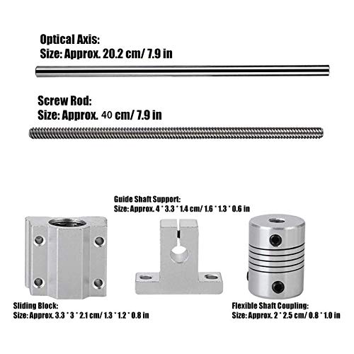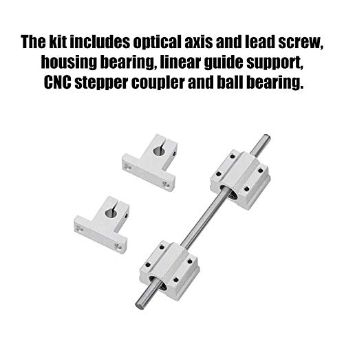 T8 Lead Screw Kit with Shaft Coupling 400mm Horizontal Optical Axis 8mm Lead Screw Dual Rail Slide 3D Print Accessories 1.Made of Aluminum, they are good abrasion resistance, not easy to rust, high precision and good strength2.The bearing housing has a certain bearing capacity and can be mounted on an ordinary precision rack with strong adaptability.3. Widely used for digital 3D coordinate measuring equipment such as precision equipment or special machinery industry:Optical axis is suitable for all kinds of electronic equipment / guide rods, drive shafts, pillars4.The kit includes optical axis and lead screw, housing bearing, linear guide support, CNC stepper coupler and ball bearing5.It fit for various types of electronic equipment / guide rod, drive shaft and propModel Number:Optical Axis Guide Rail screw settype:linear guidecolour:Silver & Graymaterial:aluminumsize:400mmPackage includes:2 * Optical Axis1 * Screw Rod1 * For T8 Nut4 * Sliding Block2 * Coupling4 * Guide Shaft Support2 * Zinc Alloy Bearing Block BearingOnly the above package content, other products are not included.Note: Light shooting and different displays may cause the color of the item in the picture a little different from the real thing. The measurement allowed error is +/- 1-3cm.Item specifics:Item type: Other