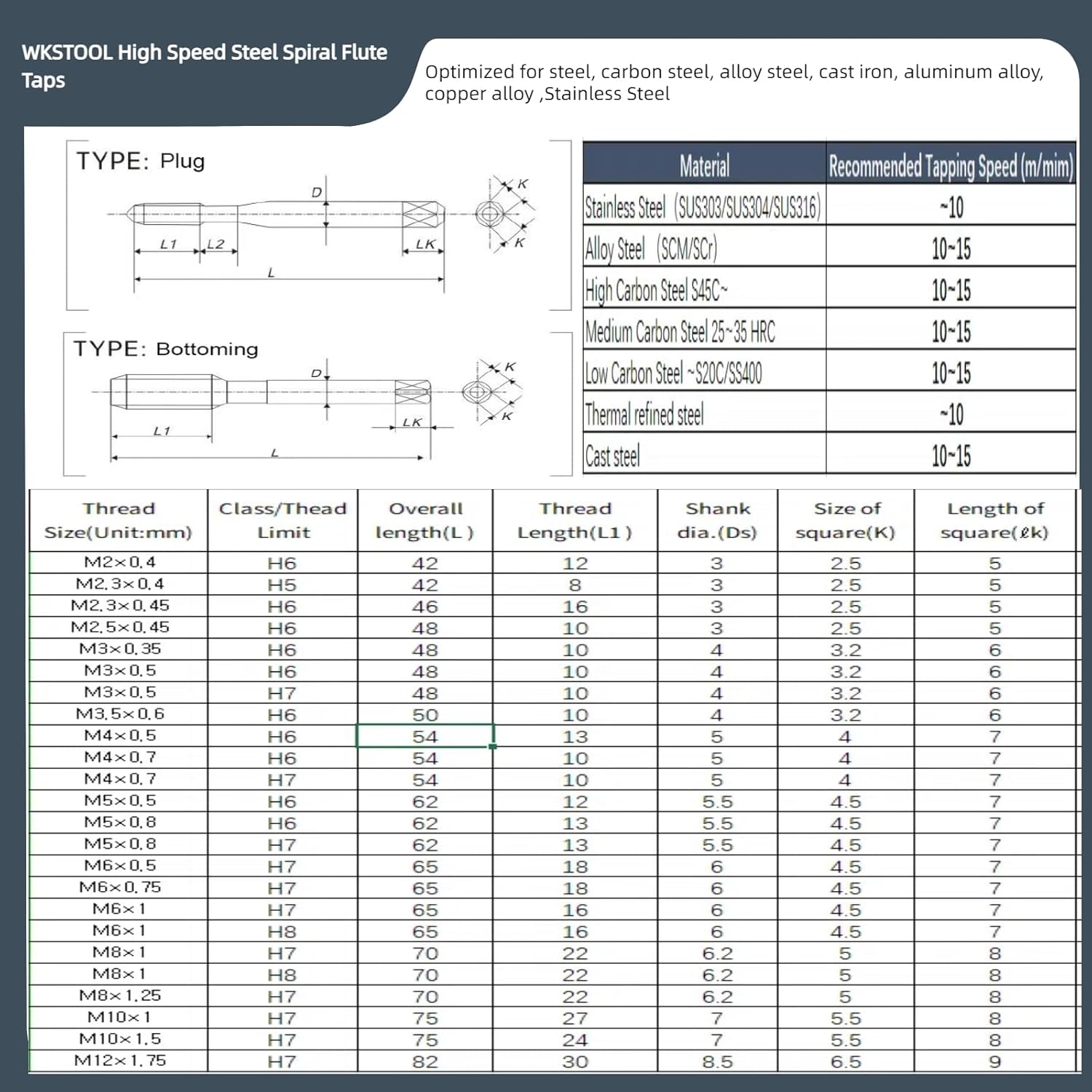 Tips for Optimal Use: Always use cutting fluid for smoother operation and extended tap life. First create the workpiece bore diameter with a drill that matches the screw thread size minor diameter,Start with a pilot hole slightly smaller than the tap's minor diameter. Maintain proper alignment to ensure straight, accurate threads.Please use a cutting speed of 5m/min or less. Clean the tap after each use to prevent material buildup. Store in a dry, protected environment to maintain sharpness. Plug-chamfer taps are versatile for most tapping applications, with 3 to 5 chamfered threads for start-to-finish tapping. Bottoming-chamfer taps form threads with 1 to 2 chamfered threads, can thread holes closer to the bottom but need more torque to start. The Bright finish on these taps provides a smooth, polished surface. The TiCN coating on these taps protects them from wear and is harder and more wear-resistant than a TiN coating. The TiN coating on these taps protects them from wear and allows them to be used at higher speeds than taps with a bright finish. The TaC coating such as high hardness, anti-adhesion, low friction coefficient.