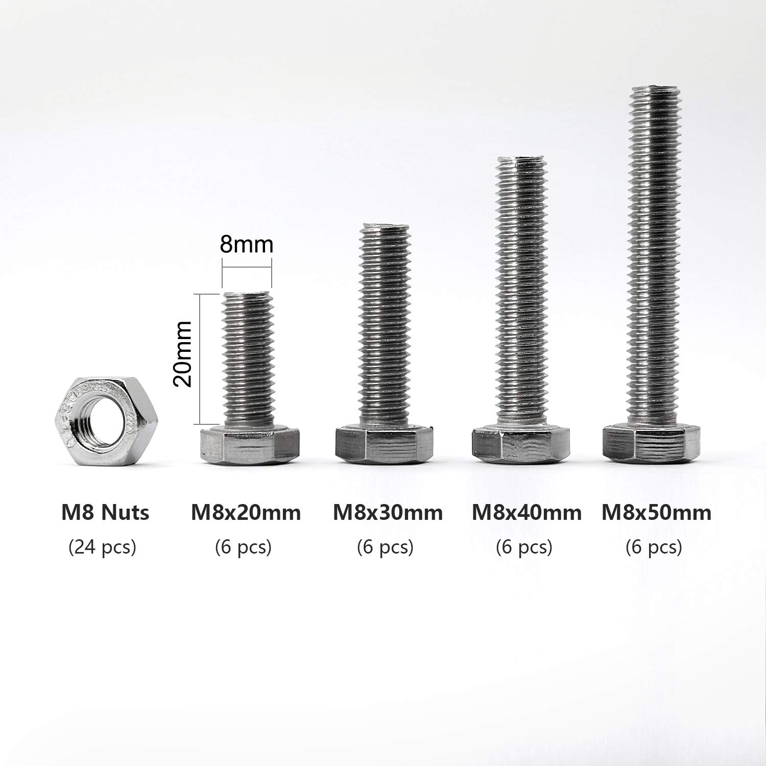 Hex bolts have a variety of uses for construction, agriculture and automotive applications. They are strong, corrosion proof, and will support all of your project purposes. High quality Stainless steel 304(18-8), which offers a high level of chemical and corrosion resistance, can be used in humid environments, and do not worry about rust. Specification: Material: Stainless Steel 18-8 (304) Thread Diameter: 8 mm Pitch Size: 1.25 mm Color: Silver Tone Package Included : M8x20mm (6pcs) M8x30mm (6pcs) M8x40mm (6pcs) M8x50mm (6pcs) M8 nuts (24pcs) Worry-free After Sales: Our goal is to provide our clients with high quality products, which is why we maintain professional after-sales personnel to ensure the satisfaction of each customer. So if you have any problems after purchasing our product, feel free contact us. We’re always at your service.