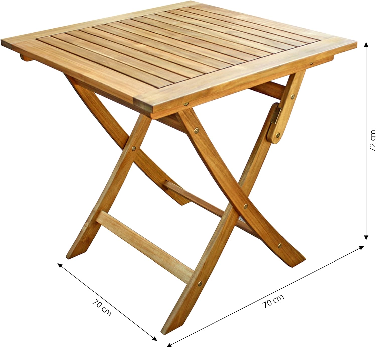 When the sun invites you to linger in the home garden or on the terrace on warm summer days, you can build your new favourite place in no time at all with the Dehner Macao folding table. Made from FSC-certified acacia wood, the table brings Mediterranean flair to your home. In just a few simple steps, you can set up the Dehner Macao folding table and fold it up just as quickly. When compressed, this beautiful table in a timeless design requires very little storage space and can therefore be easily stored during colder days. Whether alone or as a couple, the Dehner Macao folding table offers plenty of space. When unfolded, the Dehner Macao folding table with an edge length of 70 cm and a height of 74 cm is ideal for comfortably accommodating up to two adults. Whether you want to read a book in peace or invite your neighbor to eat cakes, the square table top gives you the necessary space. At the same time, it is so compact that it can also be placed on the balcony. The wood is very easy to clean, which makes cleaning the table top very comfortable. This practical folding table from Dehner is made of high-quality acacia wood. The Macao folding table is a Dehner branded product and therefore has been processed reliably and qualitatively very carefully. So you can enjoy a piece of furniture for many years that radiates a certain holiday feeling. The FSC certification guarantees that the acacia wood used for the Dehner Macao folding table comes from sustainable forests. Thus, this garden furniture is not only extremely practical and decorative, but also protects the environment.