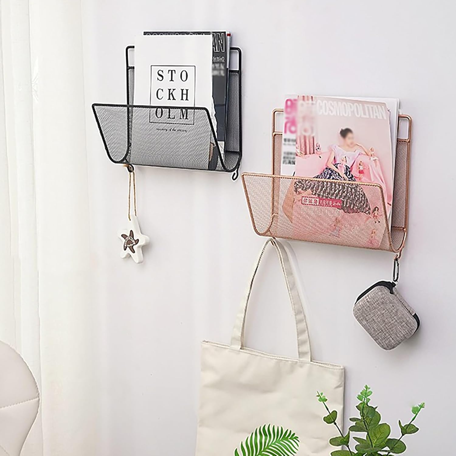 Introducing our Wall-Mounted File Organizer, a stylish and practical wire mesh magazine rack designed to offer effective storage solutions for your magazines, books, and newspapers.Keep your office or desktop clutter-free by storing files and magazines in this robust metal mesh rack. Its sleek design enhances organization while adding a touch of sophistication to any workspace.Equipped with two hooks at the bottom, this organizer provides additional storage for everyday essentials like keys and wallets, making it a versatile addition to any environment.Crafted from durable iron, this organizer ensures a stable and long-lasting structure.Ideal for various settings, it seamlessly integrates into living rooms, bedrooms, office lobbies, or hotels.The open design allows for easy access to your items, while the spacious pockets hold more without losing their shape.**Product Specifications:**- **Material:** Iron- **Color Options:** Black, White, Gold- **Installation Type:** Wall-Mounted- **Dimensions:** 29*12*26 cm / 11.4*4.7*10.2 in- **Functionality:** Storage for books, files, mail, magazines, etc.- **Number of Hooks:** 2**Package Includes:**- 1 Wall-Mounted Brochure Rack File Organizer (with installation accessories) Upgrade your space with this practical and stylish wall-mounted file organizer today!
