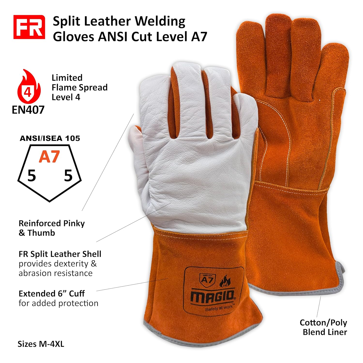 These MAGID T-REX Inferno Series Split Leather Welders Gloves — TRX878 — give you strong impact and cut resistance in addition to FR protection. This FR impact glove’s split leather shell provides dexterity and abrasion resistance and is designed with a stitched-in para-aramid blend knit fabric liner for optimal fit and dependable cut protection. On the back of the hand, MAGID’s FR M-Force Defense System deflects and absorbs impacts while delivering protection from heat and open flames up to 896°F. In addition to welding tasks, other recommended applications for these leather impact gloves include manufacturing, metal stamping, ironwork, and utility work.
