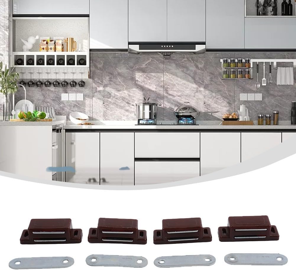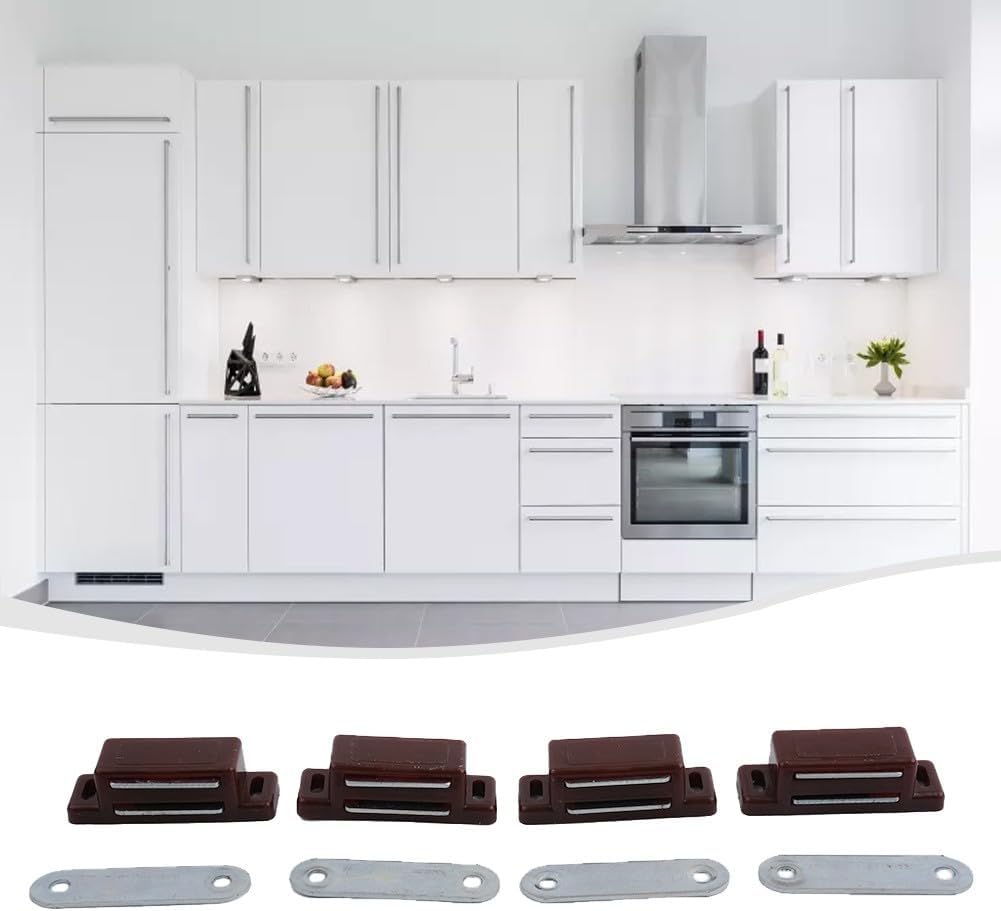 Features:1. This product is for for fastening cabinets, bookcases and cupboards safely and securely.2. Made of ABS plastic, and magnet,3. This product will guarantee to secure these doors and latches, keeping your items safe.4. Strong magnetic force, beautiful and compact structure, reliable and in use.Specification:* Material: ABS+Cold-rolled steel* Color: Black, White, Brown* Total length: 45*15*14mm (approx.)* Quantity: 4PCSPackage content:* List 1: 4 x door suction