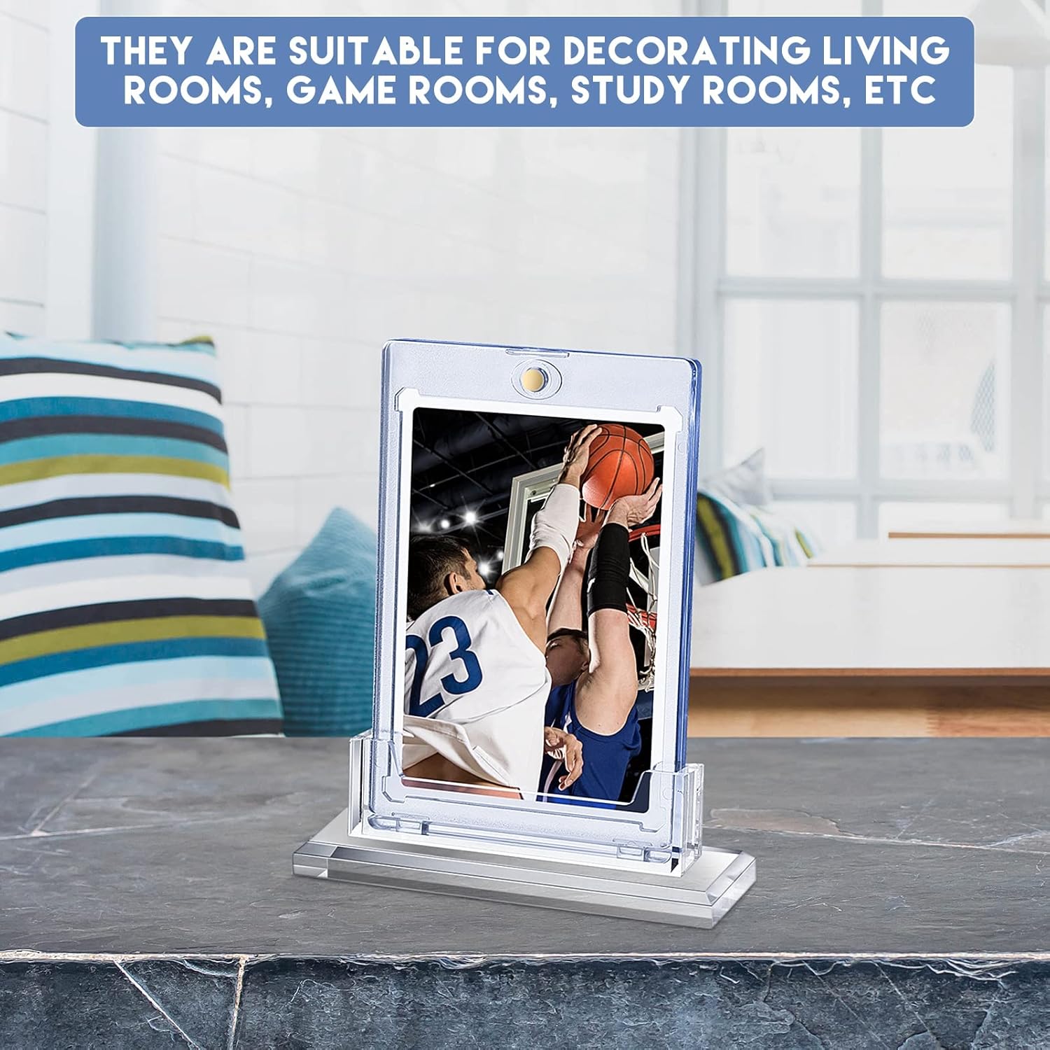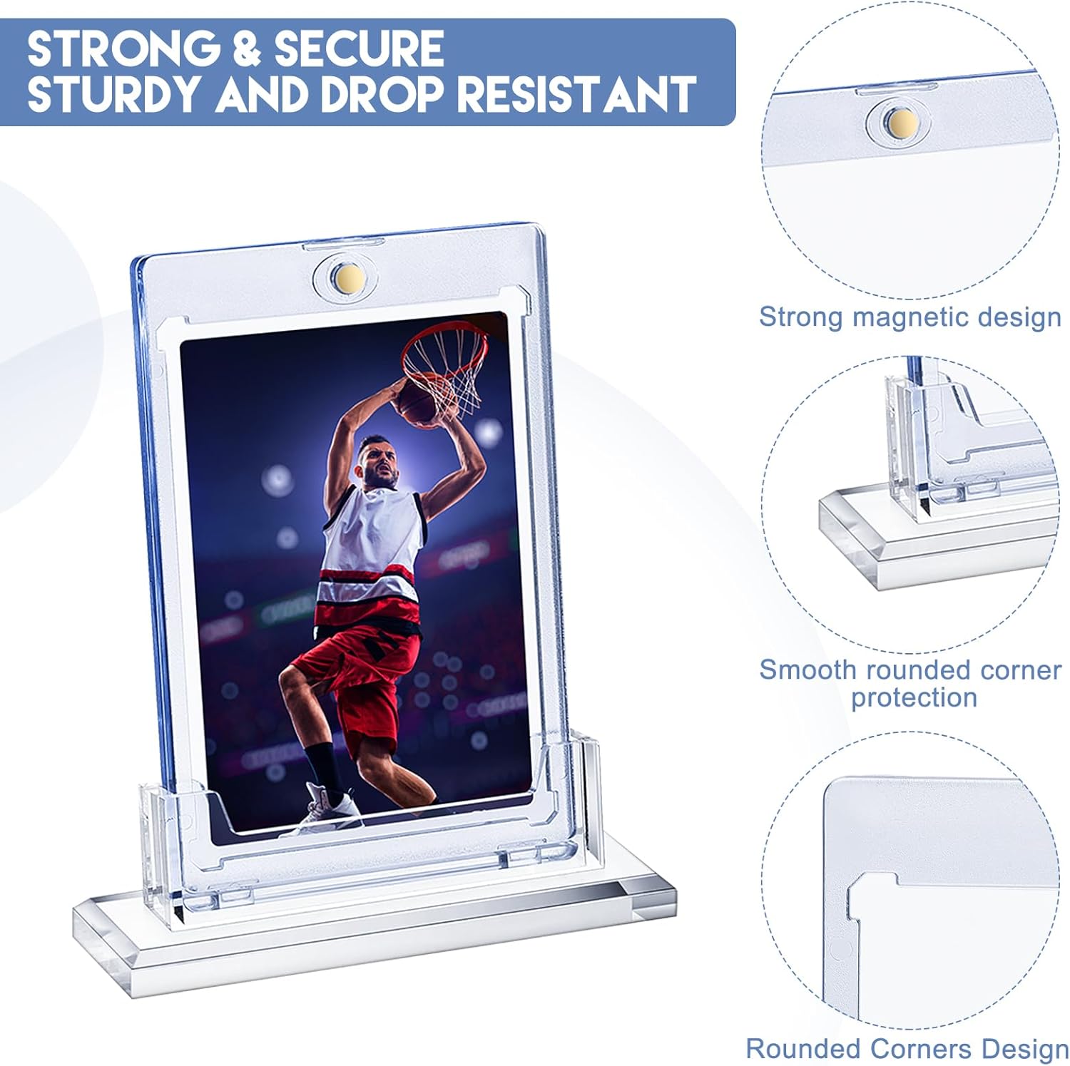Features: These swap card display sleeve protectors are not only suitable for baseball cards, soccer cards, business cards, field hockey cards, game cards, but also as a container for DIY crafts, giving you a wonderful experience. These graded card case are portable and light in weight so that they can be carried easily. You can put them in your handbag, makeup bag and luggage. Specifications: Material: acrylic Color: as the pictures shown Size: Magnetic card holder: 2.87 x 4.33 inch Acrylic stand for desk: 3.94 x 1.18 x 0.31 inch Package includes: 3 x Magnetic display cases for trading cards 3 x Acrylic stands for desk Notes: Manual measurement, please allow slight errors on size. The color may exist slight difference due to different screen displays.