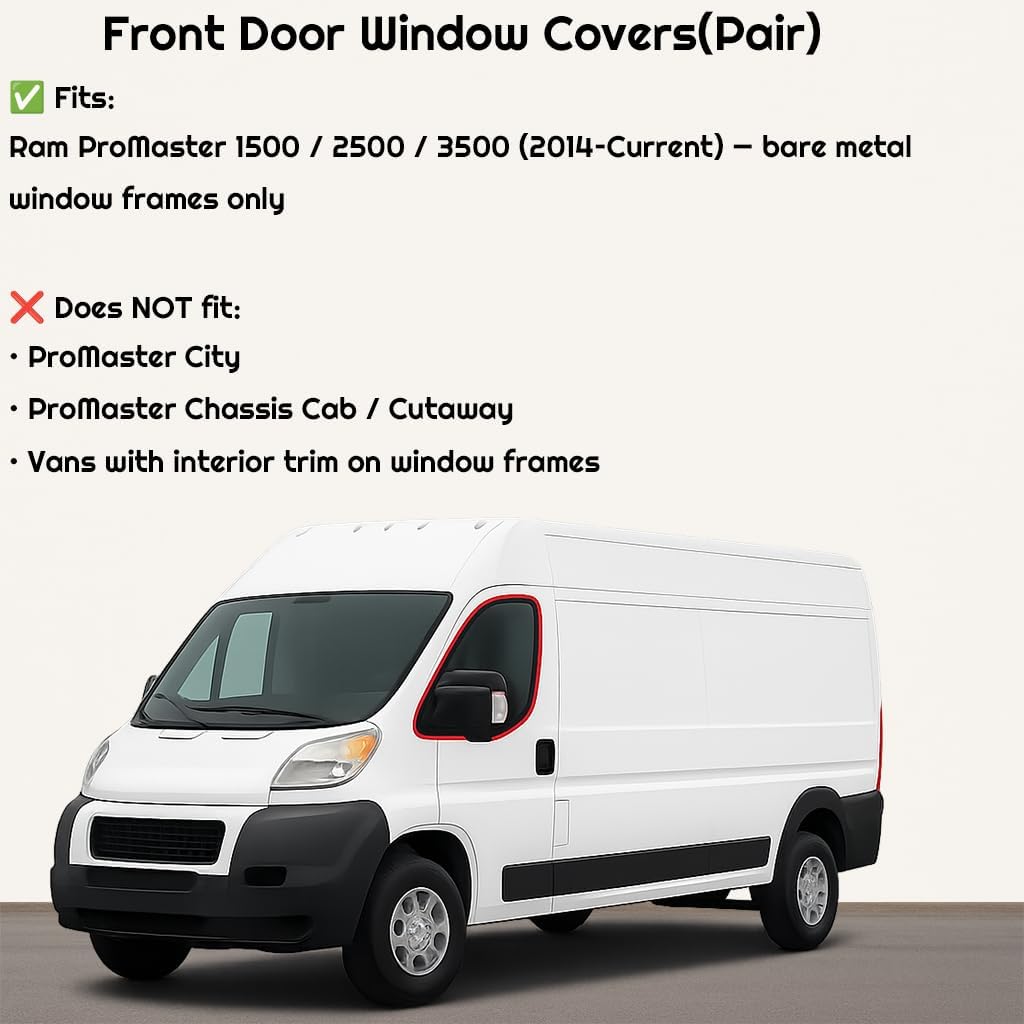 VANLUSIS Magnetic Insulated Front Door Window Covers (Pair) with Bug Screen are custom-designed to fit all 2014–Current RAM ProMaster vans. In addition to the multi-layer insulation that helps keep your van cooler in summer and warmer in winter, these blackout shades feature an integrated bug screen, allowing fresh air circulation while keeping bugs out. They provide maximum privacy for stealth camping and year-round comfort. The magnetic design allows for quick installation and removal without tools, while the dual-function design lets you switch between full blackout mode and breathable mesh mode. Each set includes two front door window covers and a storage bag for easy packing. Ideal for vanlife, camper conversions, and outdoor adventures.
