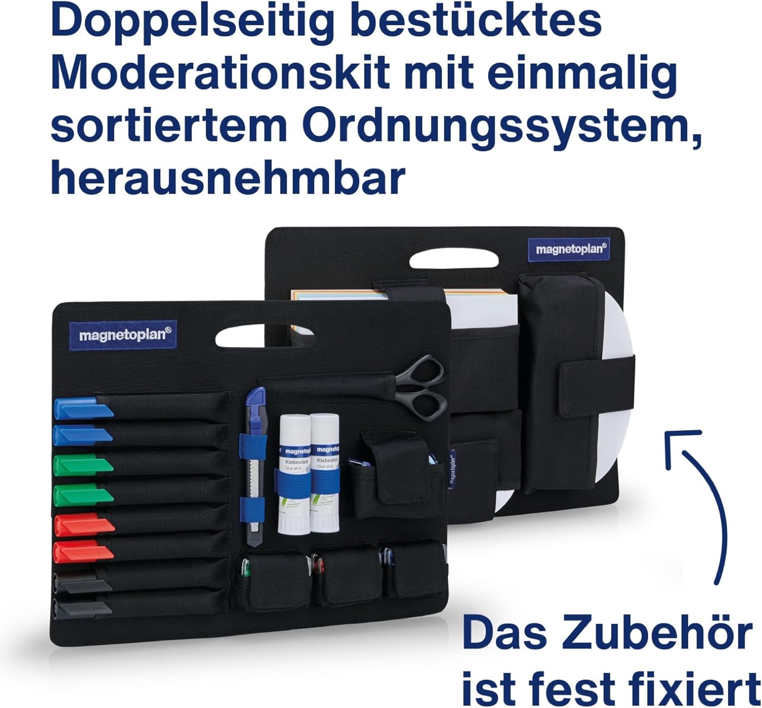 Messenger presenter bag, filled with over 1300 items, H x W x D 350 x 390 x 120 mm. Delivered = assembled. Height = 350 mm. Width = 390 mm. Depth = 120mm Material = polyester fabric. Feature = lockable. Color = Black Box contents: 1000 communication cards, 8 board and flip chart markers, 300 pin needles, 1 cutter, 1 paper scissors, 2 glue sticks, 1 adhesive film hand dispenser with 1 adhesive film roll. Product Type = Presentation Bags Basic equipment with over 1300 individual parts, for