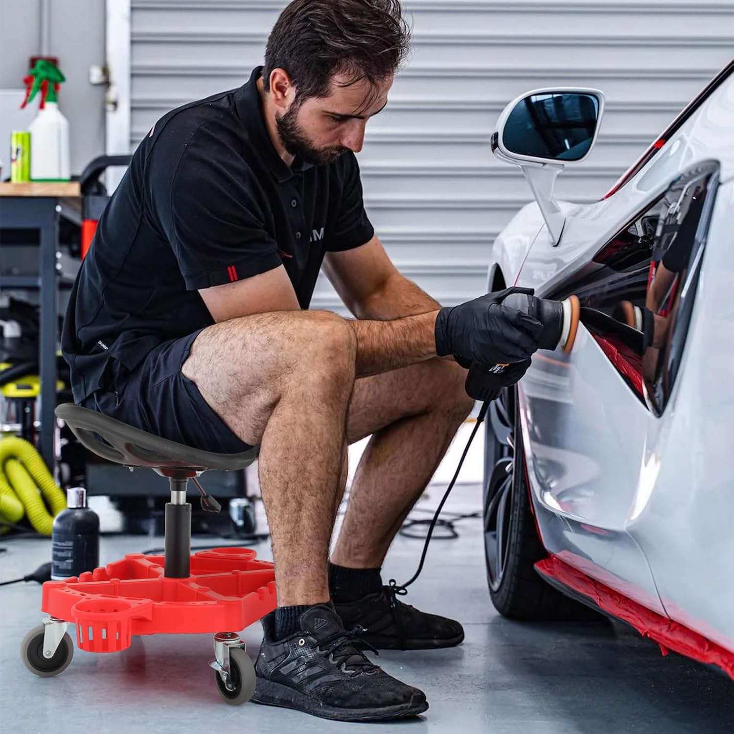 The garage stool would be great for any projects that require you to be over a lot. You can sit down and work instead of squatting. This stool makes polishing, wheel cleaning, tire & rubber cleaning, and all other exterior jobs much easier. It saves energy and helps you get the job done faster.Features:◇ Adjustable Seat Height - Adapts to users and projects.◇ Sturdy Construction - Holds up to 300 lbs weight.◇ Durable Casters & Brakes - Easy maneuverability and control.◇ Organized Storage - Keeps equipment within reach.Specifications: ◇Brand: Magshion◇Dimensions: 17.5"(D) x 29"(W) x 20-25"(H)◇Tray Size: 20 × 15.5 inch◇Cup Holder: 3.5 × 3 inch◇Seat Size: 19.5 × 15.5 inch◇Seat Back Height: 5 inch◇Seat Material: PP◇Tray Material: PP◇Frame Material: Steel◇Wheel: 2x 4" TPR Swivel Castors & 2x 4" TPR Swivel Castors with brake◇Weight Capacity(lbs): 300