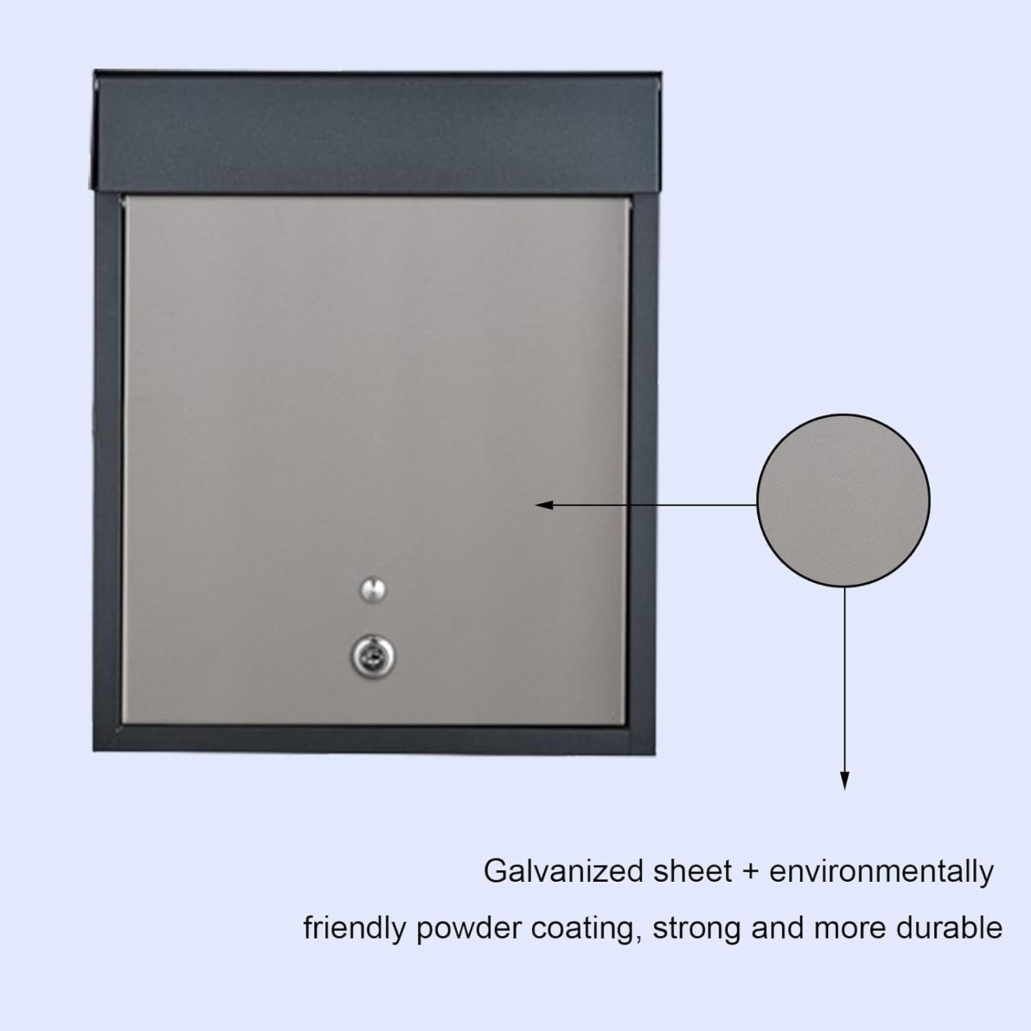 Product DescriptionThese lock and key sets are unique to every, The multiple keys allow for owner to give others access to mailbox and enough to keep a spare. Not only does it serve as a stylish statement piece for your home, but it also provides secure and convenient mail storageThe Product Features1Galvanized sheet + environmentally friendly powder coating, strong and more durable2Mushroom nail handle design, small and convenient3Noise-absorbing pad design reduces noise disturbanceMaterial:MetalColor:Black and GrayProduct Size: 11.8x5.1x14.3inPacking-1 x mailboxNoteManual measurement, there may be minor errors, please refer to theactual product, please understand.Each photo is taken in kind, but the color difference is small due to thedifference in light, display and personal color