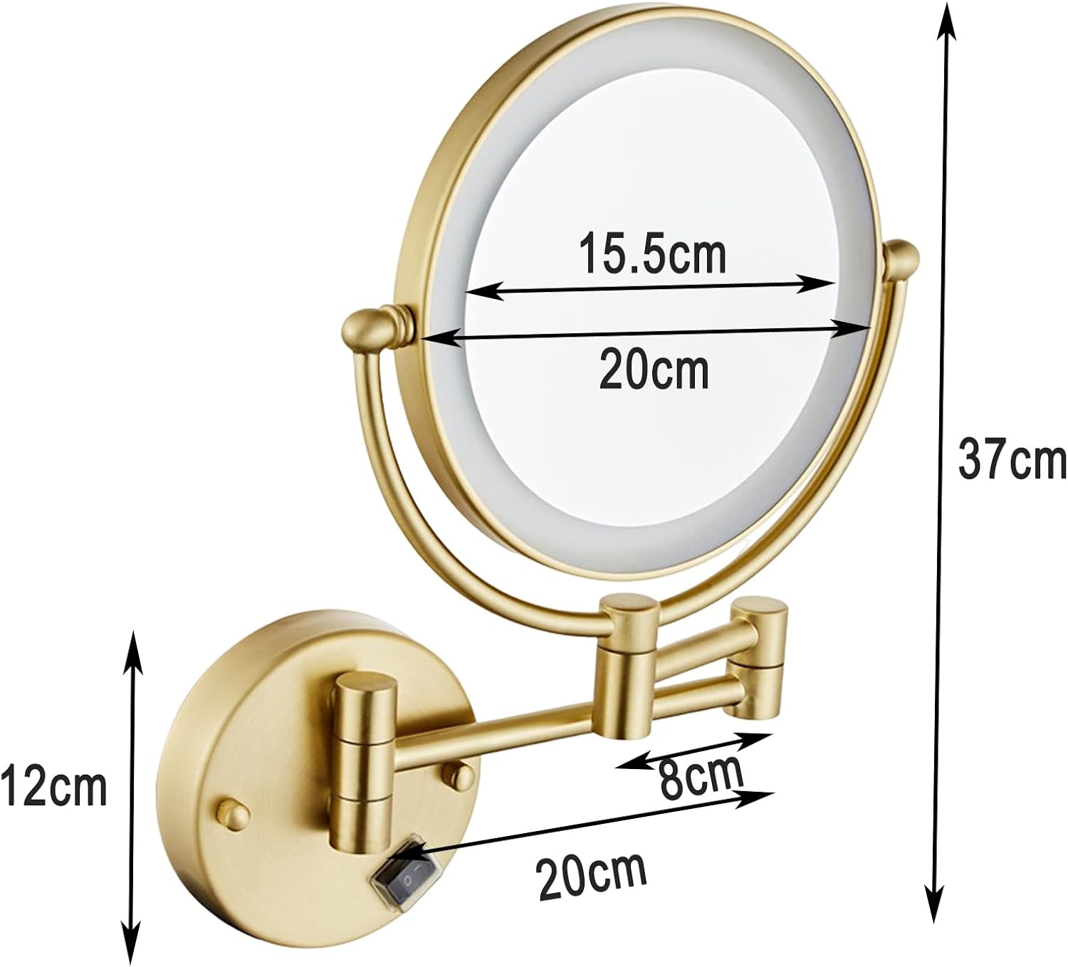 Why Choose our Bathroom Wall Mounted Makeup Mirror ?Features:1. Makeup mirror with LED light for use even in low-light environments2. Double-sided mirror with normal and magnifying mirror3. 360-degree swivel design and can be fixed at any angle you like4. Excellent quality with material, rustless,anticorrosive and durable5. Easy to install, elegant design,would be suitable for any family and hote bathroom,etc6. Ideal for applying make-up,wearing contacts and shaving,ladies daily makeup and gentlemen shaving etc❤Specification:Frame: Copper+304 Stainless SteelColor: Brushed GoldShape: roundSize: 8Inch/20cmMagnification: 3X Magnification; 5X Magnification; 7X Magnification; 10X MagnificationCharging method: USBBattery capacity: 2600mAhVoltage output: 3.5WRated power: 5WRated voltage: 220VLighting: white light, 6500kInstallation method: Hole installation❤Tips:1. Rinse the surface of the bathroom rack with clean water frequently, and dry it with a soft cloth.2. It can be cleaned with neutral mild liquid and colorless glass cleaner3. Avoid contact with acidic cleaners, coarse material agents or abrasive cleaners