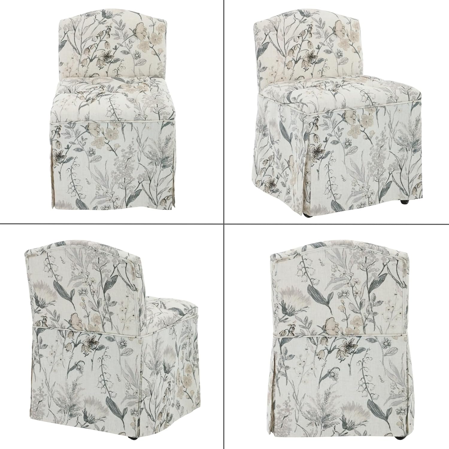 Some pieces are designed to fill a space. Others are designed to soften it. This fancy farmhouse botanical print tufted skirted accent chair belongs to the latter. With its gently arched camel-style back and classic button tufting, the silhouette feels graceful and timeless without appearing heavy. The tailored skirt drapes neatly to the floor, concealing the base and giving the chair a refined, upholstered look from every angle. It introduces a sense of polish and quiet elegance—perfect for interiors that blend traditional warmth with subtle modern touches. Unlike bulky desk chairs or overly decorative accent pieces, this design strikes a thoughtful balance. Its compact scale allows it to tuck effortlessly under a vanity or writing desk, while still offering a visually complete presence when styled on its own. In a bedroom, it becomes part of a calming morning routine. In a dressing room or walk-in closet, it adds boutique-inspired charm. In a reading corner, it creates a soft, inviting seat that doesn’t overwhelm the room. The concealed rolling base enhances everyday functionality without compromising aesthetics. The hidden casters allow smooth movement when needed, yet remain invisible beneath the skirt—preserving the chair’s clean, furniture-like appearance rather than a typical office feel. Upholstered in textured fabric with supportive cushioning, this shabby chic small chair offers a comfortable seating experience suited for getting ready, journaling, light desk work, or simply pausing for a quiet moment. The armless profile encourages relaxed posture and easy movement, especially in compact layouts or apartment living. Whether styled in a French country–inspired bedroom, a transitional living space, or a softly layered modern interior, this space-saving cottage chic rolling vanity chair blends elegance, practicality, and understated charm into one cohesive piece.