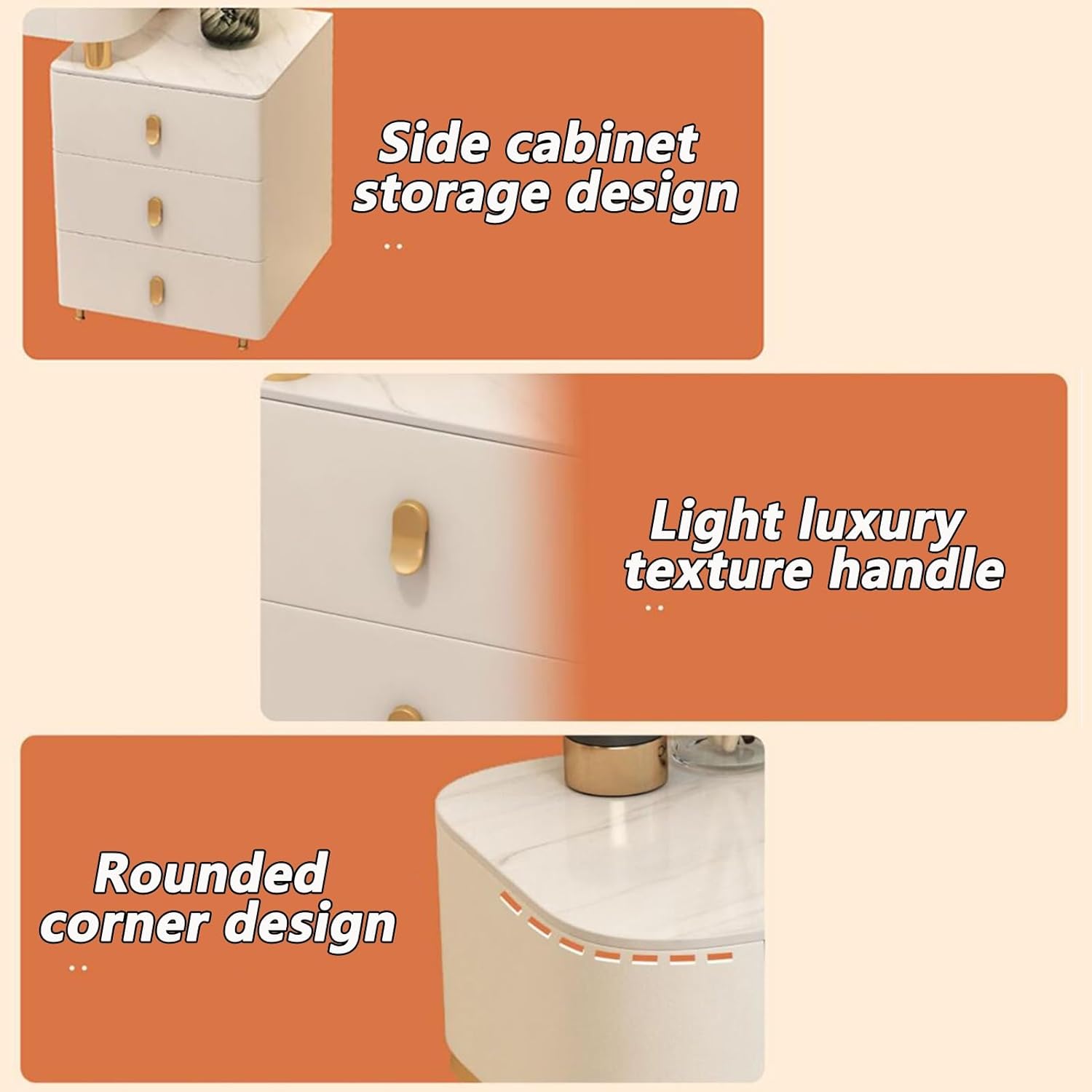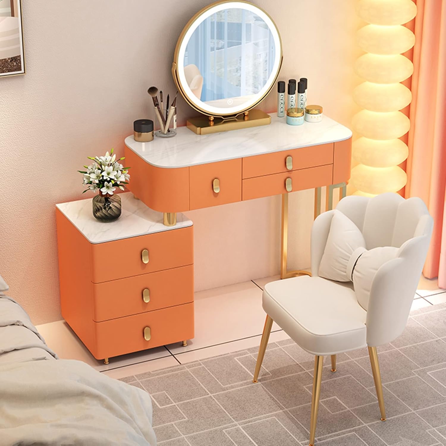 ✿The dressing table offers plenty of space for makeup in 3 spacious drawers. Thanks to the elegant modern design with gold accents, it looks very classy and fits well in different interiors. A comfortable stool and an elegant round mirror round off the high-quality dressing table. When you look in the mirror, you sit comfortably and can concentrate fully on the styling.1. Dressing table Separate storage spaces in front of you, which can hold your cosmetics, jewelry, etc., can be used as a desk.2. Girl Gift: This dressing table is loved by many girls, it is a good birthday gift or Christmas gift for girls.3. Every girl desires a glamorous dressing table with all her and makeup so she can fulfill her princess dream. This stylish shabby chic style dressing table set is equipped with mirrored drawers.✿ Product specifications:Product name: dressing tableColor: White , Orange , Pink , GrayFinishing Material: SlateSize: 80cm/31.4", 100cm/39.3", 120cm/47.2".packing list:1X dressing table1X LED mirror1X makeup tool1X storage cabinet✿Note:1. We are measuring manually, there may be an error of 1 inch, please in kind prevail.2. Color may be slightly different due to different screen display.