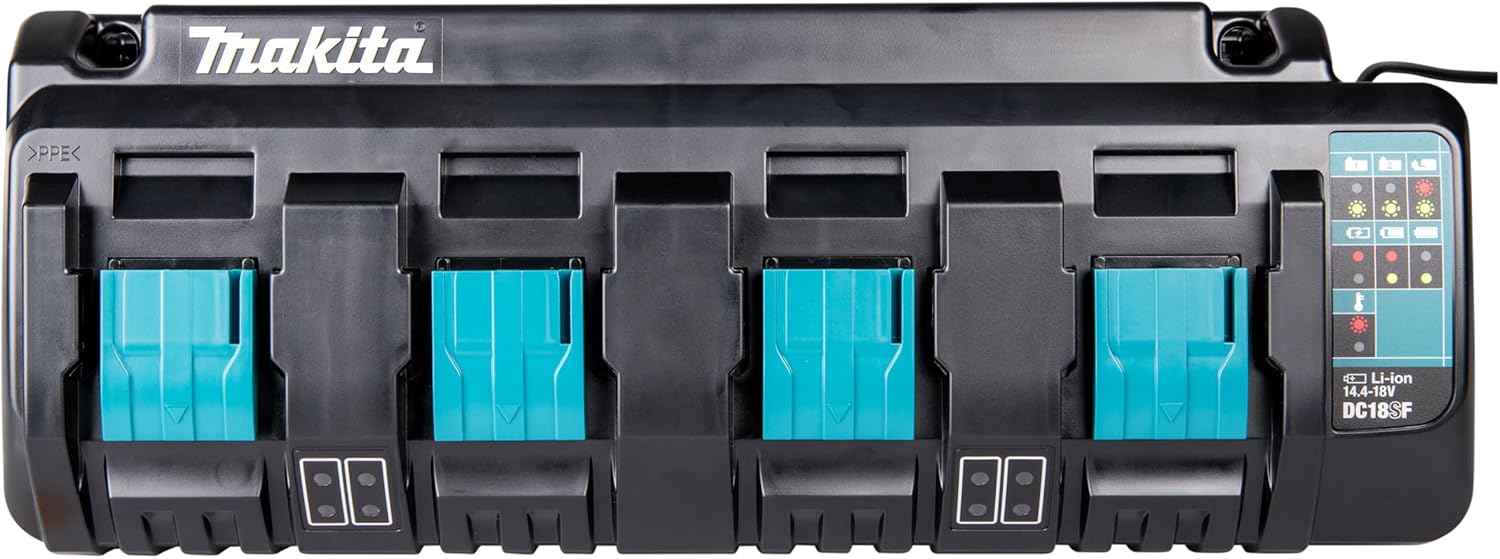 Makita 18V Lithium-Ion is the world's largest cordless tool line-up powered by an 18V Lithium-Ion slide-style battery. At the heart of the LXT Series is the 18V LXT Lithium-Ion battery and the efficient Rapid Optimum Charger. The new 18V Lithium-Ion Dual Port Rapid Optimum Charger (DC18RD) charges two batteries simultaneously, giving tool users unparalleled charging efficiency so their batteries spend more time working and less time sitting on the charger. The 18V Dual Port Rapid Optimum Charger offers key advantages for Makita 18V Lithium-Ion cordless tool users. The exclusive built-in fan cools the battery by forcing air through the battery's air vents during the charging process for faster charging. The charger communicates with the battery's built-in chip throughout the charging process to optimize battery life by actively controlling current, voltage and temperature. The result is category-leading charge times: two 18V Compact Lithium-Ion 2.0Ah batteries in only 25 minutes; two 18V LXT Lithium-Ion 3.0Ah batteries in only 30 minutes; two 18V LXT Lithium-Ion 4.0Ah batteries in only 40 minutes; two 18V LXT Lithium-Ion 5.0Ah batteries in only 45 minutes.
