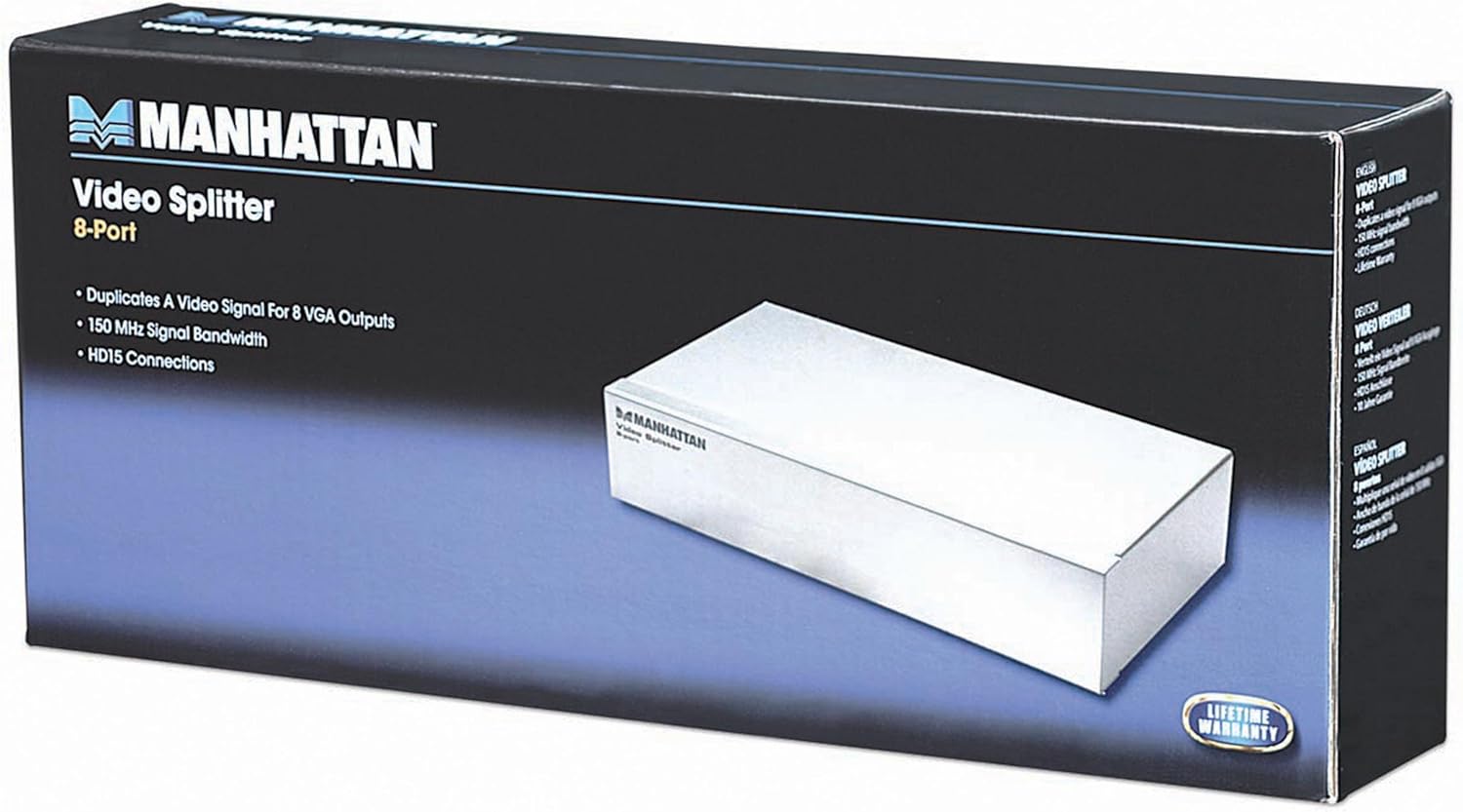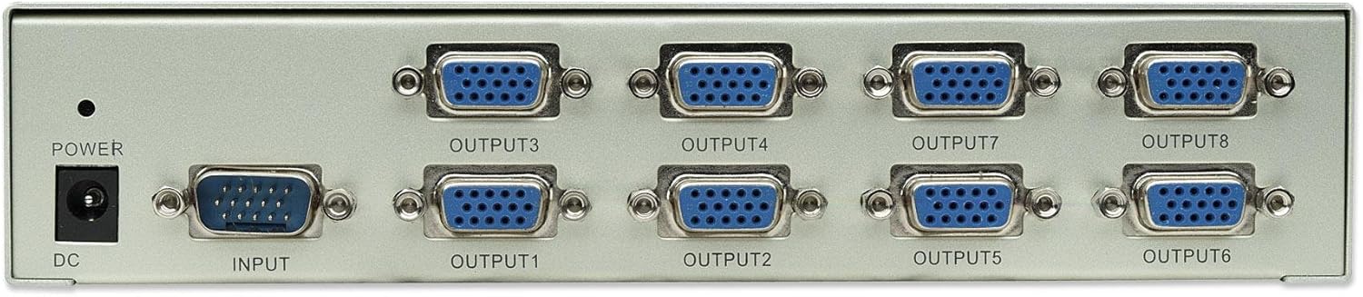 · duplication of a video signal for 8 VGA outputs · signal bandwidth of 150 MHz · HD15 connections · computer video splitter distance: 7.5 m · video-monitor splitter distance: 75 m · connectors: 1 HD15 male, 8 HD15 female · Support a maximum resolution of 1600 X 1280 and VGA signal types for, duration · 9V DC power adapter/1 to included ·. Dimensions: 63 x 302 x 128.5 mm; 1.3 kgPackage content: · Video splitter · Feeder · User manual