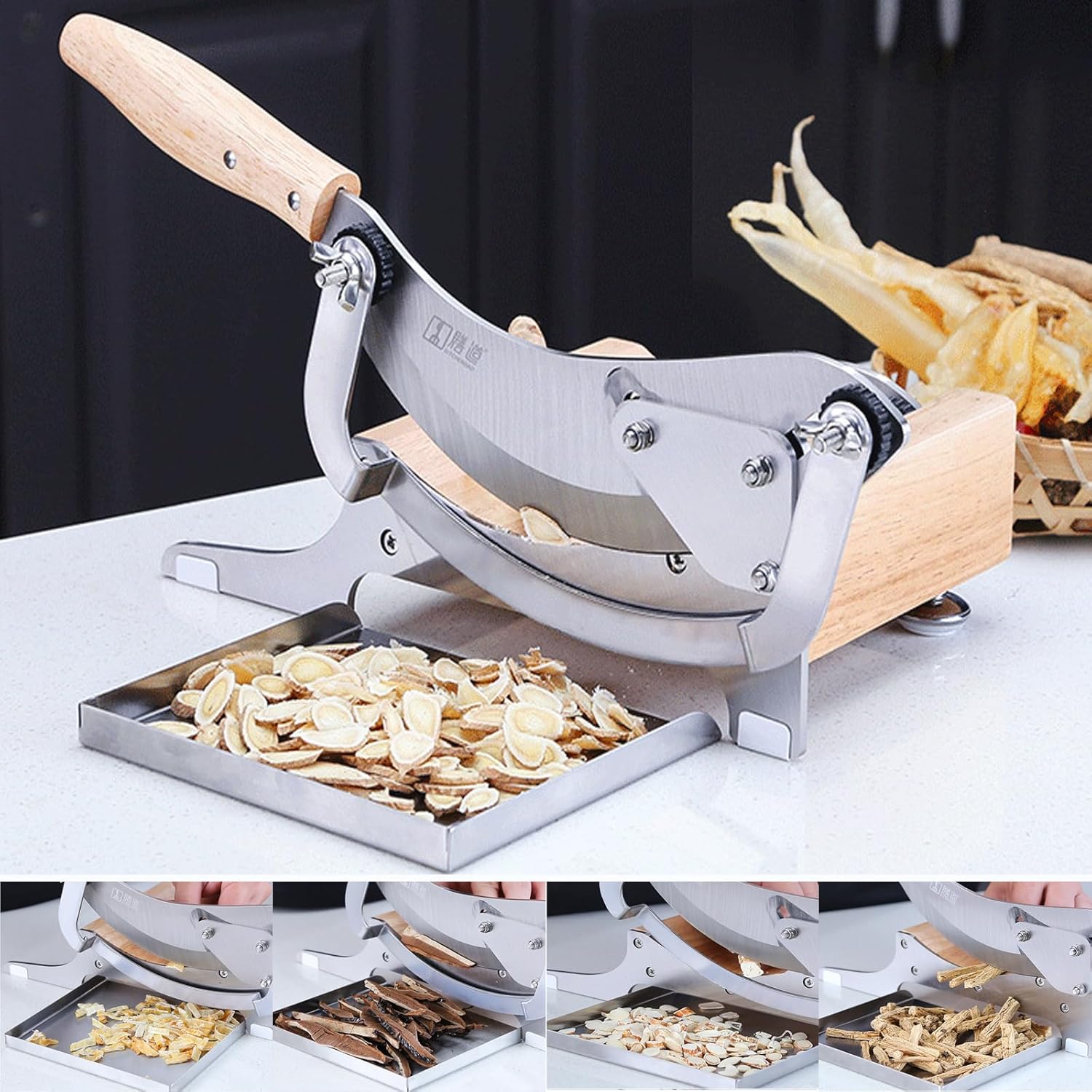 Specification:Product Name: Chinese Medicine SlicerProduct Material: Stainless Steel, Rubber WoodColor: SilverFixed Blade Length: 102mmApplication: Kitchen, PharmacyCutting thickness: 0~12mm/ 0.47inProduct Size: 36.5*19*14cm/ 14.4*7.5*5.5inPackage weight: 2.2kg/ 4.9lbPacking included:1x Chinese Medicine Slicer1x Storage Shovel1x Cutter SharpenerAlmost all kinds of dry medicinal materials can be cut, such as ganoderma, floral glue, codonopsis, astragalus, panax notoginseng, american ginseng, root of hispid fig, maca.But medicinal materials like ginseng, panax notoginseng and american ginseng, need to be softened before cutting. It is recommended to put them in the microwave and heat them for tens of seconds.FeatureBalanced Support Foot DesignThe tail support is extended, the stress point moves backward, the base is not easy to roll over, and it is safe and stableThick Solid Wood BaseManual Chinese Medicine Slicer Made of rubber wood,great texture,durable enough.Solid Wood HandleInternally grooved, smooth, and comfortable to hold. You will not feel tired after long time cutting.4mm Thick BladeThe thickness of the blade is 4mm, and the cutting hardness is strong, can process medicinal materials for a long time.Magnetic designMagnetic design is provided at the bottom of the bracket, which can be used to store the shovel.Storage trayChinese medicine slicer is equipped with a storage tray to collect the cut ingredients and use them cleanly and hygienically. In addition, we also send a Cutter Sharpener as an aid.Easy to cleanRinse the manual biltong slicer in the sink after each use, and then keep it dry.