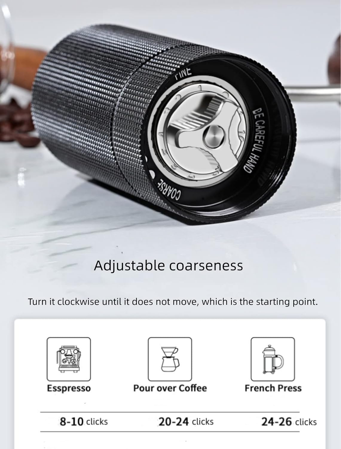 1.When using for the first time, please grind a little coffee beans and pour them out to clean the grinding core. 2. The product is a precision device, and the interior of the machine body cannot be directly washed with water. Cleaning the grinding core requires using a grinding brush or air blowing. 3. The edges of the grinding core are relatively sharp, so please be careful not to cause injury. 4. Only roasted coffee beans can be added to the bean warehouse, and no other materials can be added. Product size: 6.10 in✖1.97 in,Handle length 6.89 inches. This product may seem a bit expensive, but please rest assured that this is definitely not a low-cost item. On the contrary, its workmanship is meticulous and its cost is not low. We focus most of our attention on the internal workmanship of the product, and its appearance is also very beautiful. However, it is not ruled out that there are very few products with slight hanging traces, but it is definitely not a defective product.