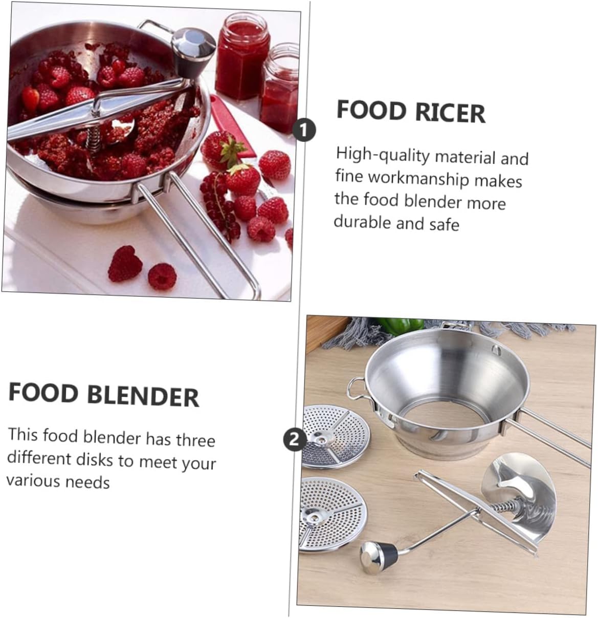 Package List 1 x Set Food Blenders Characteristics -Size: About 33.50X19.00X8.00cm/ 13.17X7.47X3.14in kitchen mill. -Material: Stainless steel manual potato ricer. -Color: Silver, coffee multi-functional small grinder. - Made of stainless steel material, for use vegetable grinder mill. - Ergonomic design make it easy incredibly easy to puree fruits and vegetables and separate the food and , effortlessly mashes and sieves foods hand chopper - Spring-loaded lever with a suitable tension for exchange and assemble food blender. - 3 stainless steel grinding discs for preparing foods of fine, medium and coarse textures apple grinder. - Smooth surface make it super easy to clean, dishwasher stainless steel blender for spices.Goods Descriptionmanual potato ricer Smooth surface make it super easy to clean, dishwasher .metal blenders The food is made of stainless steel material, for use.kitchen mill Ergonomic design make it easy incredibly easy to puree fruits and vegetables and separate the and , effortlessly mashes and sieves foods