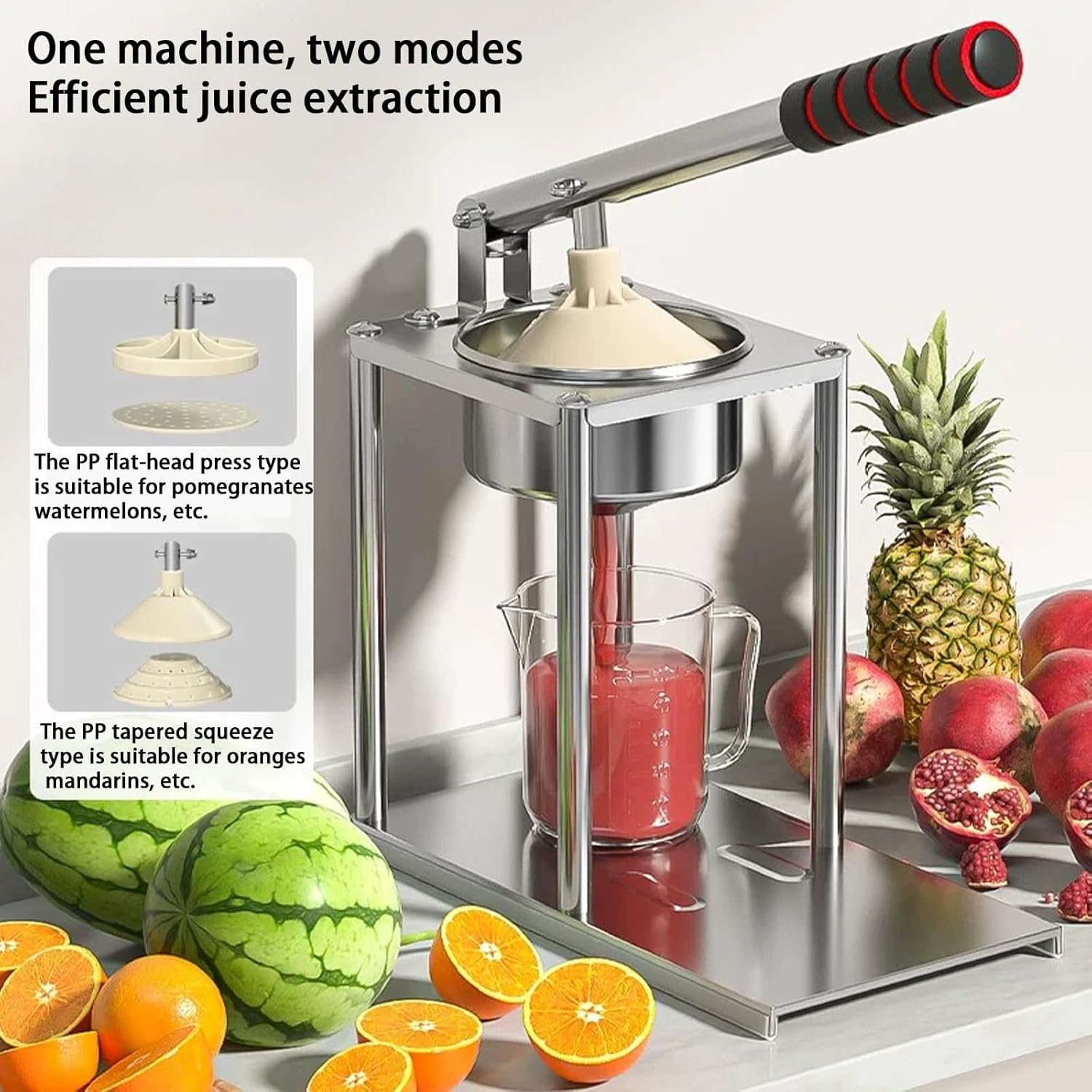 Product SpecificationsProduct Name: Manual Juicer/Lime Squeezer Stand Material: 304 Stainless SteelColor: SilverDimensions: 13 x 24.8 x 20.5cmFeatures1.This Manual Juicer features PP flat pressing (for pomegranates, watermelons) and PP cone pressing (for oranges, tangerines) to handle diverse fruits efficiently. The 3.9mm aperture filter removes pulp while preserving flavor, and the large-diameter design ensures even pressure for fast, thorough juice extraction.2. Built with 304 stainless steel for safety, durability, and easy cleaning, it includes anti-slip grips and an extra-thick base for stability comparable to a Cast Iron Citrus Juicer. Just cut fruit, place it, and press lightly—anyone can quickly make vitamin C-rich juice.3. Detachable parts enable thorough washing with no hard-to-reach areas. Its space-saving size includes a 300ml measuring cup, making it a practical Commercial Manual Fruit Press Juicer for effortless home or on-the-go use.Package List: Manual Citrus Press x1