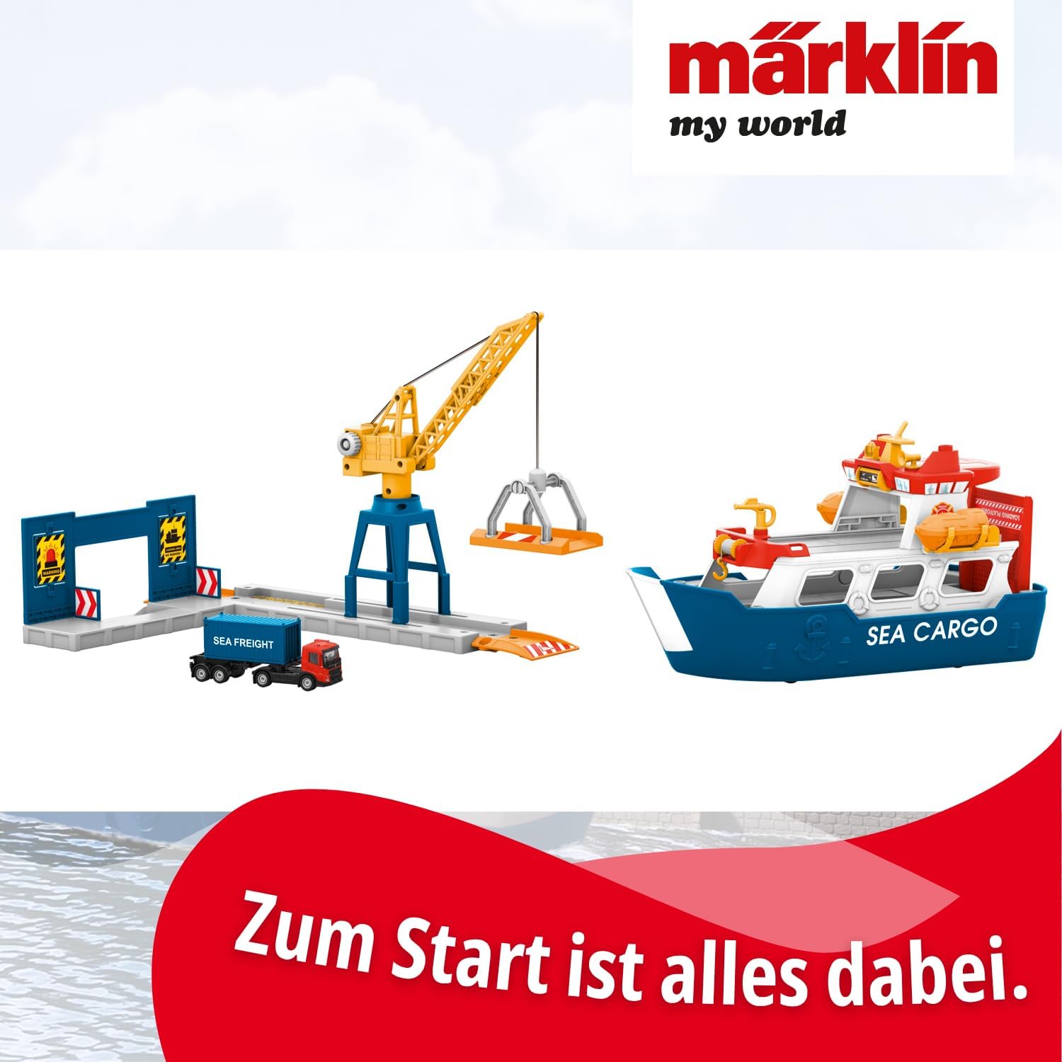 The cargo ship and the port station contain many different game functions - the highlight is the port crane for loading different goods. There are many features to discover on the cargo ship: folding loading ramps and a movable ship deck for various loading and unloading options, a winch, a water sprayer, a rotating target indicator on the ship's bridge and a helicopter landing site on the top deck. Thanks to the movable ship deck, you can easily get into the interior of the cargo ship. The cargo ship is floatable and can therefore also be taken with you in the bath for playing. The small lifeboats are made of a flexible material, which allows you to spray water with the lifeboats. The port crane serves as an ideal loading of containers and vehicles. The crane is equipped with a magnetic hook and also has a loading ramp. A track of the crane allows you to reach a large loading radius for many possible loading actions. Operating functions of the crane: folding and extendable crane arm, 360° rotatable and the crane hook with a hand crank for lifting and lowering. Below the crane there is a road as access for vehicles. The road connections are compatible with the Majorette Creatix road system. Port station with a docking point for the loading dock of the cargo ship. Harbour wall with rotating windows. Includes a truck with container trailer. The many functions bring a lot of fun for creative play on the theme of port logistics. Cargo ship and port crane as a sturdy kit suitable for children aged 3 and over. Sticker sheet and assembly instructions are included. Delivered in individual parts.