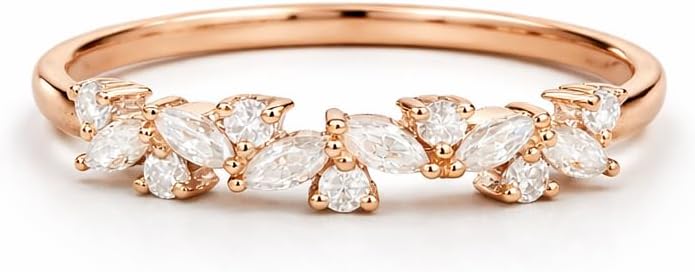 This Marquise & Round Cut Moissanite Wedding Band for Women showcases a refined vintage-inspired design with sparkling floral details. The half eternity band features carefully set marquise and round moissanite stones that reflect light beautifully from every angle. Finished in 14K rose gold plating, this slim and stackable band pairs effortlessly with engagement rings or stands alone as a graceful statement piece. Designed for comfort and elegance, it’s perfect as a wedding band, anniversary ring, or promise gift that symbolizes everlasting love.
