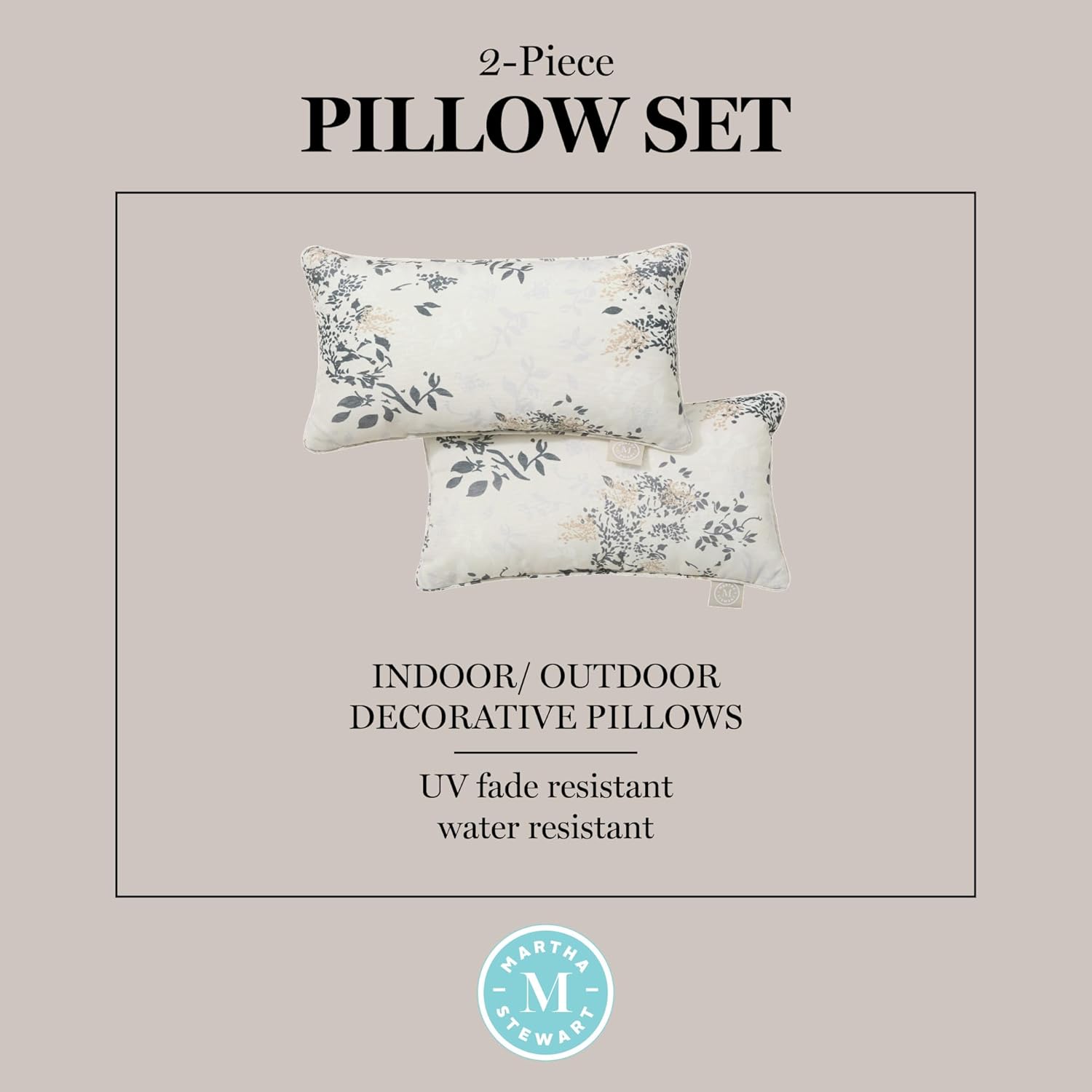 Bring comfort to your outdoor living spaces with the Martha Stewart Charming Foliage indoor/outdoor decorative pillow 2-pack set. Printed with a charming floral design, these pillows will add comfort and style to your outdoor décor. Use these decorative throw pillows indoors or outdoors, as they’re made with UV-fade and water-resistant materials and are soft for everyday use. This indoor/outdoor decorative pillow set includes two filled throw pillows made of 100% Polyester, making them easy to clean. Simply spot clean or handwash as needed for continued use in your home. Standard 100 by OEKO-TEX Certified.