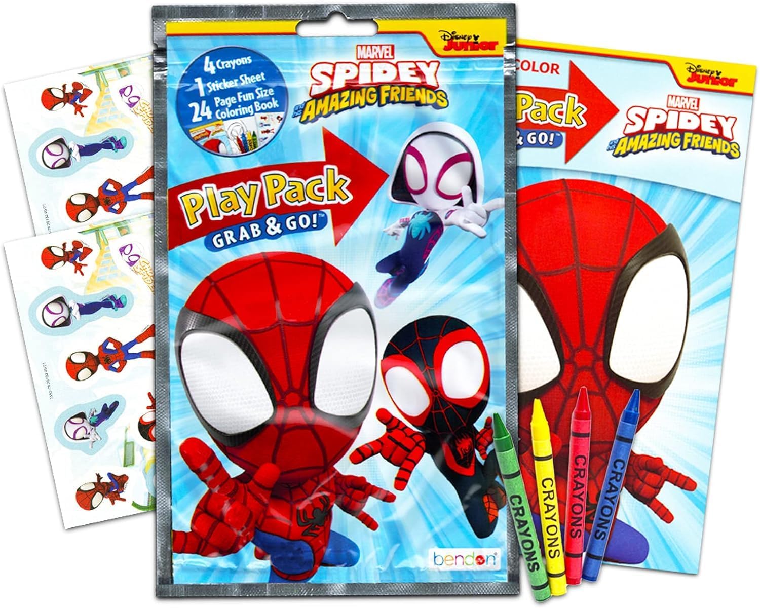 Spidey and Friends Coloring Books for Kids - Bundle with Spidey and His Amazing Friends Coloring Book, Play Pack, Stickers, More | Spidey and Friends Coloring Set for Boys, Girls. This Spidey and His Amazing Friends coloring set includes a Spidey and Friends coloring and activity book with a mystery sticker and a Spidey and Friends Play Pack with mini coloring pages. These Spidey and Friends coloring and activity books will be the perfect addition to any birthday party as party supplies, party activities, party favors, or goodie bag fillers! Complete with a large array of Spidey and His Amazing Friends coloring and activity pages, this Spidey coloring book set is perfect for all Spiderman fans, boys and girls alike. Officially licensed Spidey and His Amazing Friends coloring and activity book set for kids also includes a Beach Kids superhero door hanger.