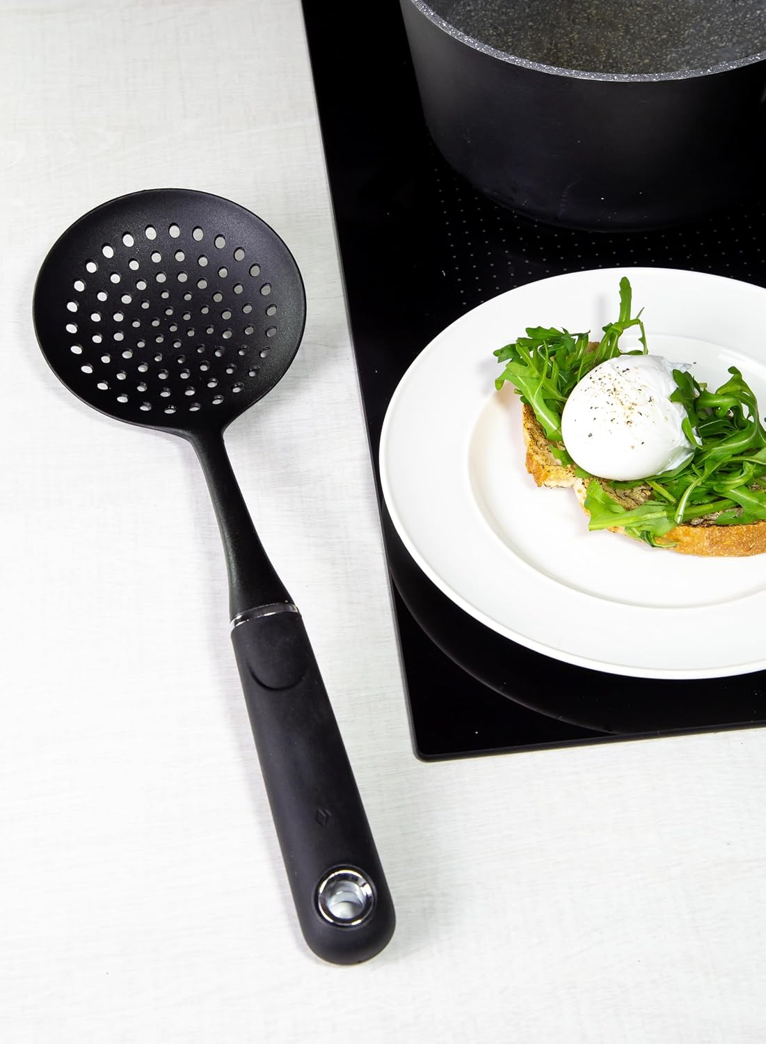 This skimmer spoon provides all the versatility, durability and comfort you'd expect from Masterclass, with the added benefit of hard-wearing nylon. It’s safe to use on any cooking surface, because Masterclass has used high-quality nylon that’s very robust, but gentle on non-stick pans. This premium skimming ladle also features masterclass’s unique nylon handle. Smooth, broad and soft to touch, it assures comfortable use and Slip-free results. Use it to master a wide range of kitchen tasks. Its perforated surface makes it easy to skim stews, soups and stocks as they simmer on your hob. Or you can use it to scoop up and drain vegetables to serve.