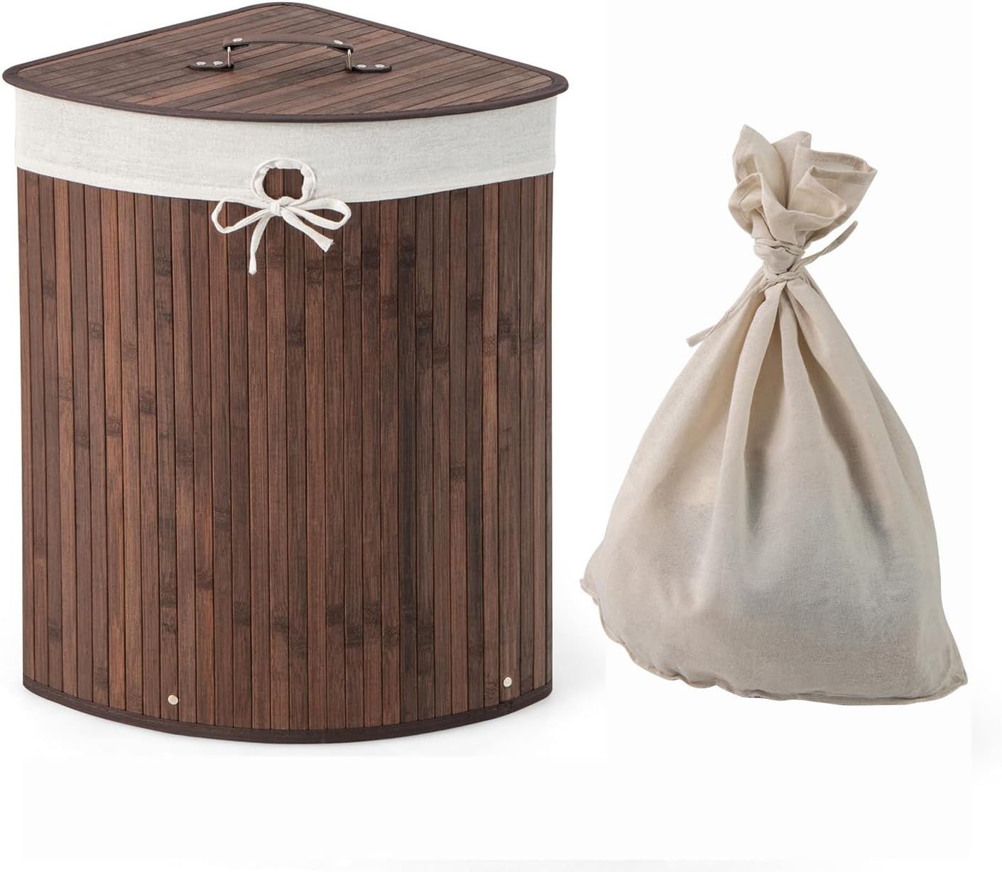 Crafted from high-quality bamboo material, this laundry hamper adds both reliability and natural elegance to your home. Designed to fit into 90-degree corners seamlessly, this bamboo laundry hamper features a triangle shape, which maximizes the limited space. And the space saving design also comes with a large inner storage space, with its holding volume up to 58 L. Equipped with a removable liner bag, which makes it easy to transport clothes to the washing machine. Besides, the polycotton fabric is also machine washable, which offers much convenience. The removable lid with handle helps to cover messy clothes and avoids smell from spreading. The minimalist appearance allows this hamper with lid accommodate to bedroom, bathroom, apartment and laundry room. At last, the installation of this clothes hamper is straightforward, for you can finish without tools.