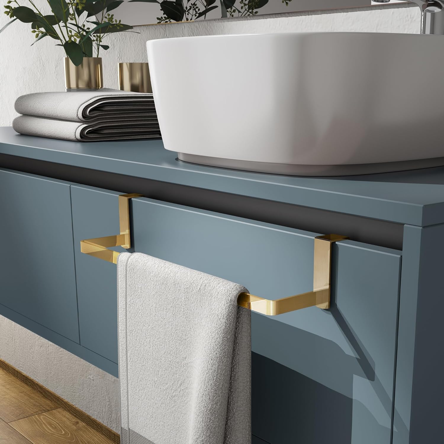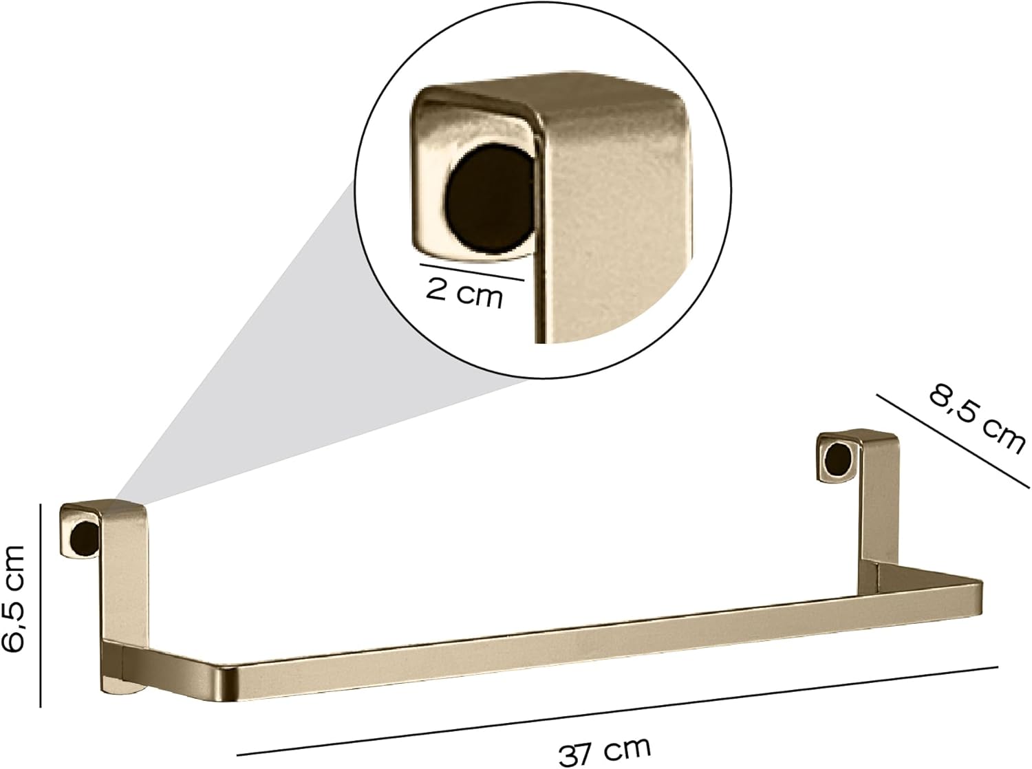 Universal hanging towel rail for both bathroom and kitchen for furniture and doors, 20 mm thick, made of stainless steel AISI 304 in matt gold finish. Practical and versatile product that allows you to preserve and create space, convenient to put towels in the bathroom and in the kitchen. Being a hanging item does not need holes, it can be moved without any effort and put it where it suits us. It has rubber stoppers that allow the furniture to be preserved. Aesthetic towel rack capable of decorating all environments adding to these aesthetics and functionality