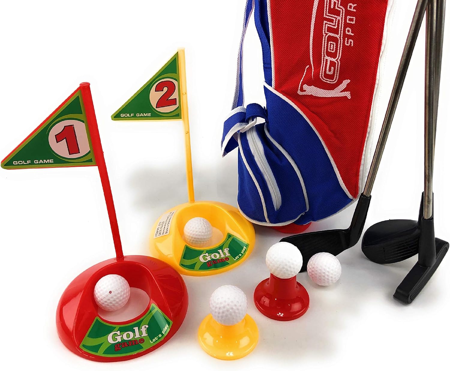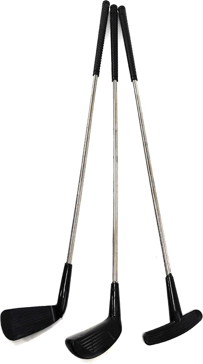 Matty's Toy Stop 15 Piece Deluxe Toy Golf Set with Bag is AWESOME! The ultimate golf set for kids ages 3 and up. Set Includes 1 Driver, 1 Pitching Wedge, 1 Putter, 2 Tees, 5 Golf Balls, 2 Practice Holes with Flags, and a Bag! Durable golf clubs are constructed of a metal shaft, with plastic pieces and measure approx. 23.5" each. Whether your child already loves golf or you want to introduce them to this challenging and fun sport, this golf game set for kids is exactly what you need to help your kid practice their golfing skills. Golf promotes both physical and mental development. Golf takes a great deal of concentration, patience and manners, so playing with these golf clubs and balls will enhance your kid s observation, imagination, and judgment skills, and it will help them adopt the culture of healthy competition. Makes a great gift and is perfect for schools, camp, indoors, outdoors and so much more. For Ages 3 and up - Fun for the whole family! - Set is for righties only.
