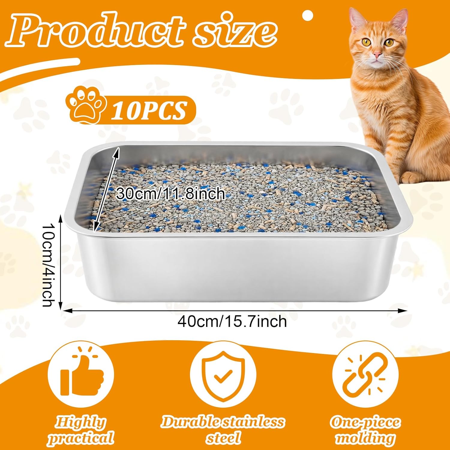 Features: Our litter box low entry design minimizes stress and refusal instances among cats. The lowered threshold addresses the needs of kittens and senior cats, preventing inconvenience that can lead to litter box avoidance, thereby maintaining consistent usage habits. Designed for hygiene-conscious households, our stainless steel cat litter box deters urine seepage and stays odor-free even with long-term use. This ensures a tidy and germ-free space, making it an optimal choice for anyone prioritizing health and safety. Specifications: Material: stainless steel Size: 15.7 x 11.8 x 4 Inch Package includes: 10 x Box Notes: Manual measurement, please allow slight errors on size. The color may exist a slight difference due to different screen displays