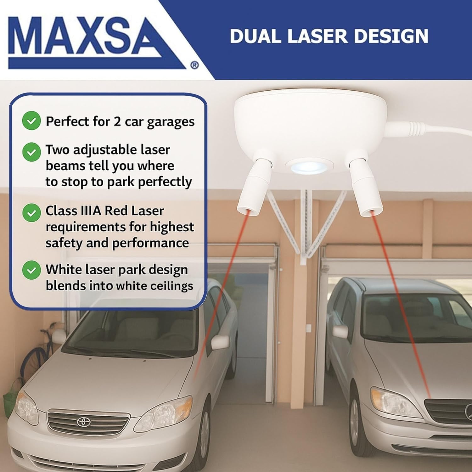 The Dual Garage Laser Park with LED light is motion activated and guides you into your perfect parking spot. Drive forward until the laser beam hits the pre-determined spot indicating you are parked correctly. Perfect for tight garages. Stop worrying about hitting sports or lawn equipment or putting dings or dents on your car! LED lights also light up your garage whenever you are there. Minimize risks of trips or falls.