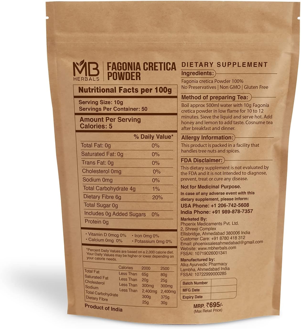 100% Pure Fagonia cretica PowderQuantity: 500g / 1.10lbs / 17.5oz Fagonia cretica is also known as: Virgin's Mantle Dhamaso / Dhamaaso Dhamasa / Dhamaasa Dhanvyaas Dosage: 20g Fagonia cretica Powder to be taken daily in form of a tea.Method for Preparing Fagonia cretica Tea: Take 10g of Fagonia cretica Powder in 400ml (approx) water and soak the powder overnight. Next morning, shake the water + powder mixture well and then boil on a low flame (boil slowly) to reduce the water quantity to half (200ml approx). Drink the Tea after filtering the Powder through a fine seive or cloth. It is more advisable to consume the powder along with the tea without filtering. Please DO NOT add Sugar or Tea. Dhamasa tea can be cooled down and mixed with Carrot Juice or any other fruit juice to make it more palatable. The Tea should be consumed few minutes after the meals in Morning and Evening Tea can also be consumed in 3 to 4 intervals in smaller quantities. It can be consumed in cold also. Daily Dosage of Fagonia cretica is 20g in form of a Tea. The Tea should be consumed as above, for 2 weeks. Fagonia cretica powder can also be consumed directly. In India, it is recommended to be consumed with Ghee (Indian Butter).