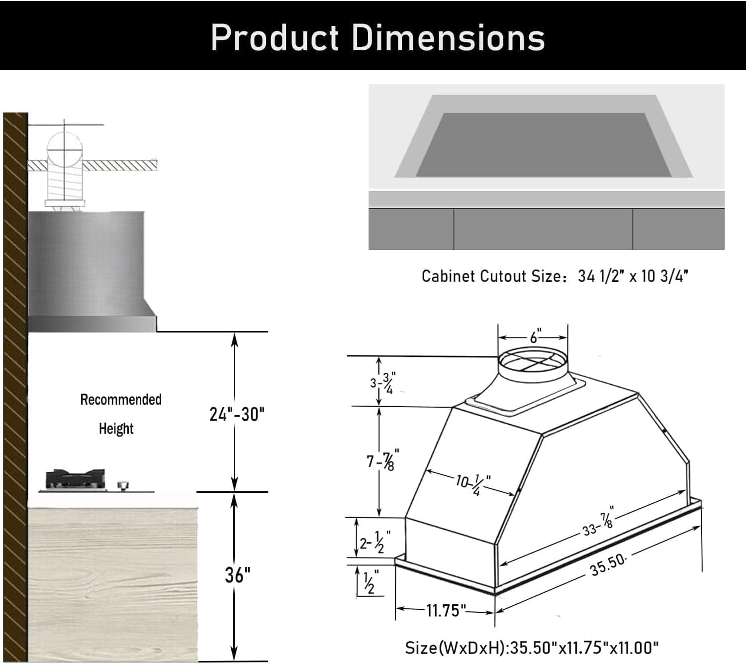 | Included Components | Mounting Screws, Range Hood Insert 36 Inch, Top Air Outlet, User Manual, Vent Adapter |