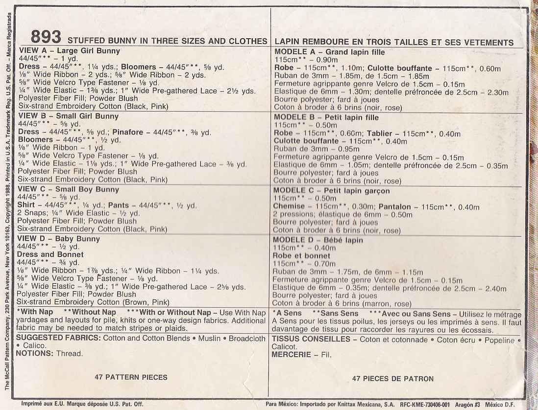 Makes large girl bunny (25"), small girl bunny (20"), small boy bunny (20") and baby bunny (14").