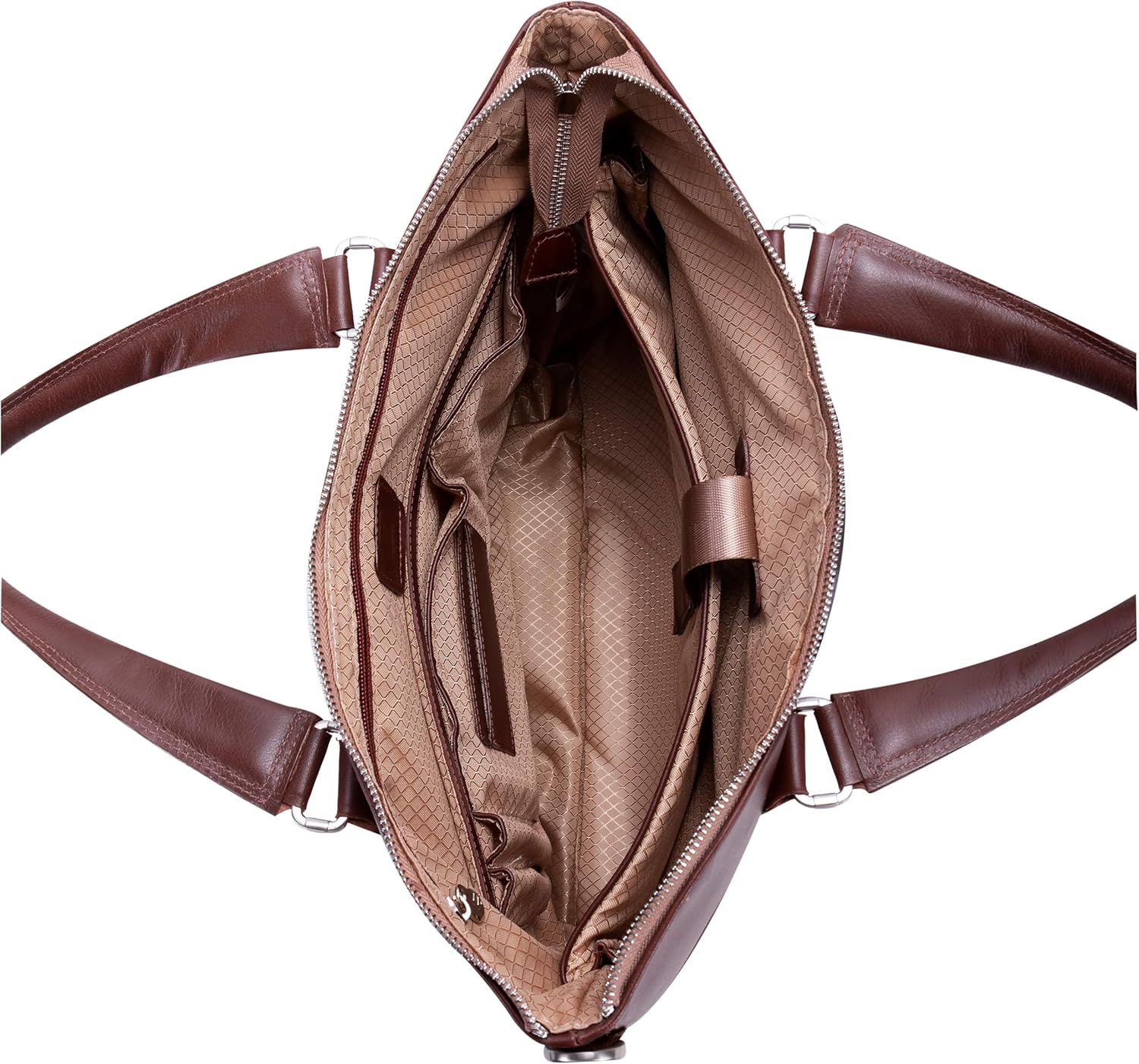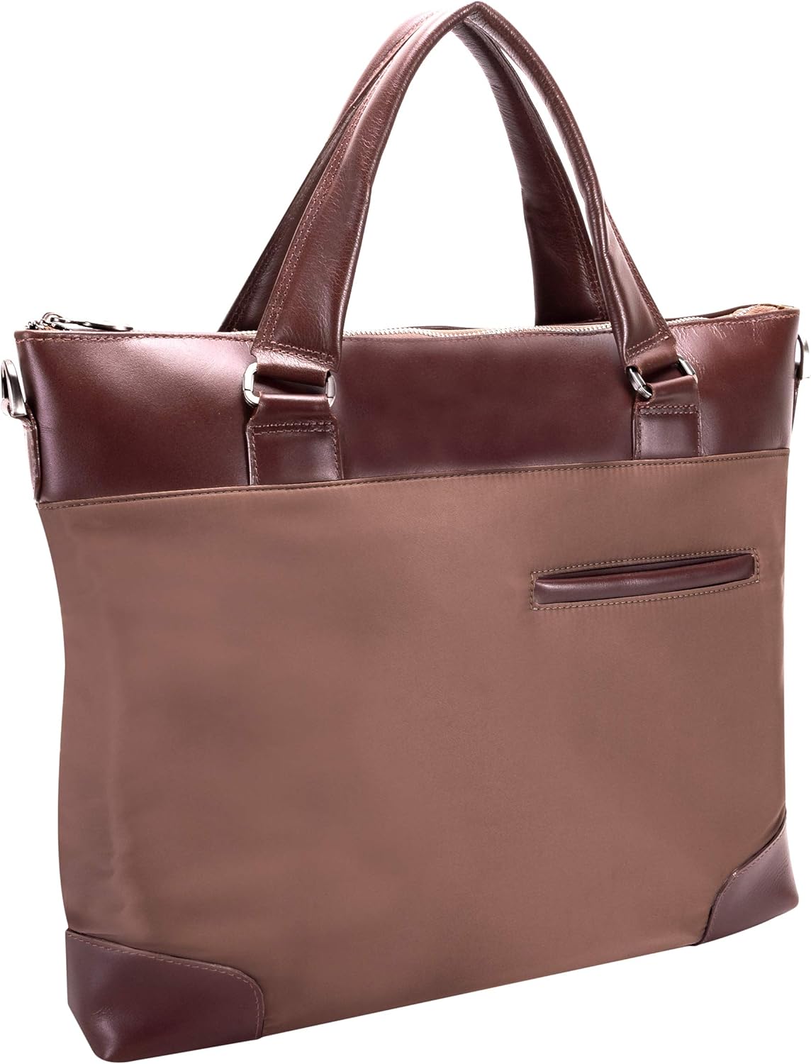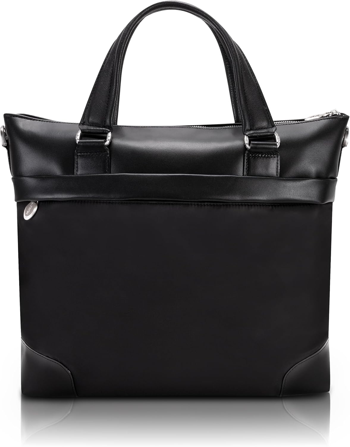 Modern nylon brief with leather accents. Fully-lined interior with leather accents with padded laptop compartment. Interior tablet pocket with organizer for business cards, pens, and accessories. Secure full-length interior zippered pocket. Silver accent hardware and metal zippers. Exterior front zipper file pocket. Removable and adjustable nylon strap with leather shoulder pad.