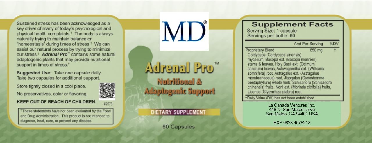 This special adrenal fatigue supplement was formulated to fight severe stress along different biochemical pathways, including the immune, endocrine and nervous system. MD Adrenal Pro capsules is induced with nine active adaptogens to assist your body protect itself against stress. Adaptogens are a group of pharm logical compounds that aids the ability of an organism to react accordingly to stress, maintain structure and function from the damaging effect of stress with faster recovery of normal body processes. This natural adrenal fatigue supplement works quickly so you feel sense of wellness and peace the next day. Let’s face it, it is impossible to eliminate stress but you can help by supporting your adrenals to adjust rather than react to stress. About us: MD is where science meets beauty and wellness. Get empowered to be your best. MD is committed to excellence and providing innovative and science-based personal care products for the Hair, skin, lash and wellness. Founded in 2006, MD is sold in over 24 countries. At MD, we want you to achieve beauty and wellness. MD combines best of western and eastern science to create products so you can feel and look your best. Our supplement will: Reduce stress Boost immune system Provide strength Package Includes: 1 x MD Adrenal Pro Capsule (60 capsules) Direction for Use: For general adrenal support and stress, take one to two stress tablets daily. While for more therapeutic application, take four capsules for the whole day in individual doses.