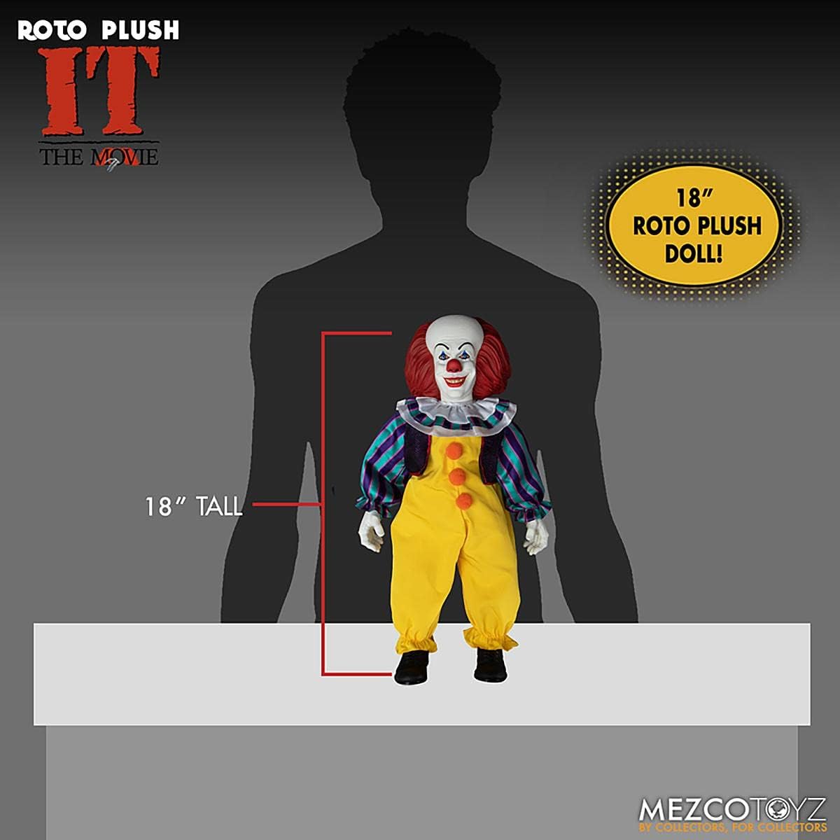 From Mezco Toys. Pennywise wants to creep you company! The perfect cuddle buddy or movie watching companion, this Roto Plush will be right by your side…watching you sleep…haunting your nightmares. Sporting a maniacal grin, Pennywise is 18" tall, features sculpted parts on a floppy plush body, and wears his signature clown suit from the classic made-for-TV miniseries, IT. There's nothing to be afraid of. We all float down here! MDS Roto Plush IT (1990): Pennywise comes packaged in a window box, perfect for display.