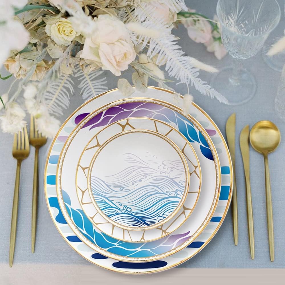 Hand decals, hand decals can combine the pattern with the porcelain blank, and have the advantages of more fit and no wrong paste.Depicted in real gold, it is more wear-resistant and brighter in color.The high bone china material is not easy to leave peculiar smells, food color, and oil stains are easy to clean.It is made of 43% bone meal and fired twice at high temperature. The porcelain is and transparent with good light transmittance.The shape of the device is beautiful and elegant, and the surface is moist and bright.Porcelain with gold and platinum trim should not be heated in microwaves and ovens.If there are tea stains, you can use lemon juice or vinegar to clean it. If you have scratches, you can squeeze the toothbrush on the loofah and wipe it gently.Do not use hard materials such as steel balls to wipe hard to avoid damage and scratches to the enamel.Try to clean with a soft cloth at a moderate temperature, and avoid alternating hot and cold with parrot scrubbing, so as not to damage the device.Do not burn directly with an flame.Package Include4pcs*plate