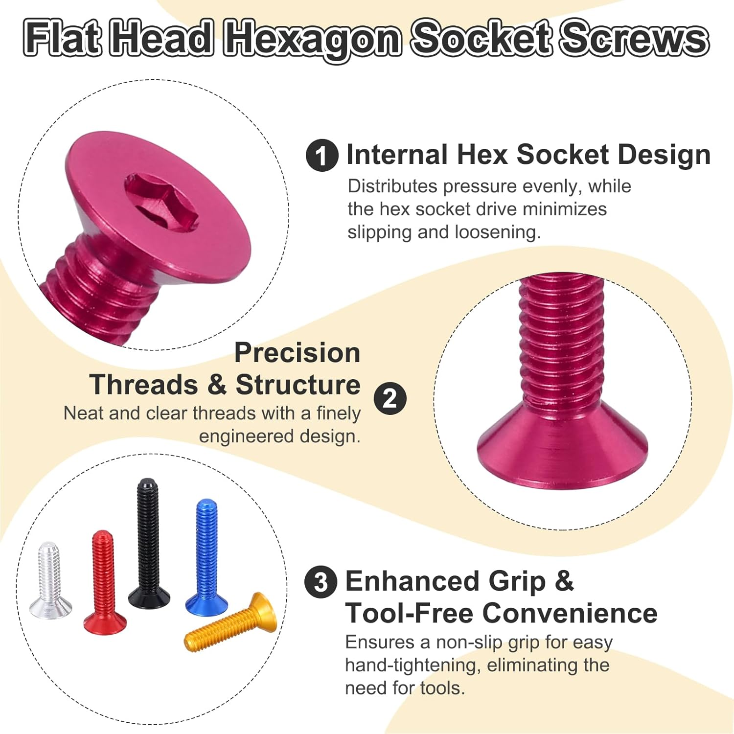 What is it?These hexagon socket screws are high-strength, precision fasteners. The flat head and internal hex socket design enable efficient torque transmission, ensuring a secure and tight fit. They are widely used in lightweight applications such as drone accessories, model toys, 4WD vehicle parts, bicycles, and more.What will I get?Flat Head Hexagon Socket ScrewsTotal Size: M3 x 10mm / M3 x 0.39"Head Diameter: 5.8mm / 0.23"Hex Socket Width Across Flats: 2mm / 0.08"Thread Size: M3 x 0.5 mm; Material: Aluminum AlloyColor: Rose RedIn the package: 10 Pcs x Hex Socket ScrewsAre there any advantages of this product?Aluminum Alloy Material: Made of aluminum alloy, these screws offer excellent wear resistance, oxidation resistance, and rust prevention, ensuring long-term stable performance.Precision Threads & Structure: Neat and clear threads with a finely engineered design. The countersunk head distributes pressure evenly, while the hex socket drive minimizes slipping and loosening, providing reliable support for model parts and toys.How to use it?These countersunk head screws are easy to install. Select a correctly sized hex key, align it vertically into the screw socket, and tighten evenly. Avoid excessive force to prevent thread damage or stripping.What should I notice?Please confirm the required screw specifications before purchasing. Incorrect sizes may result in poor connections and affect normal use.