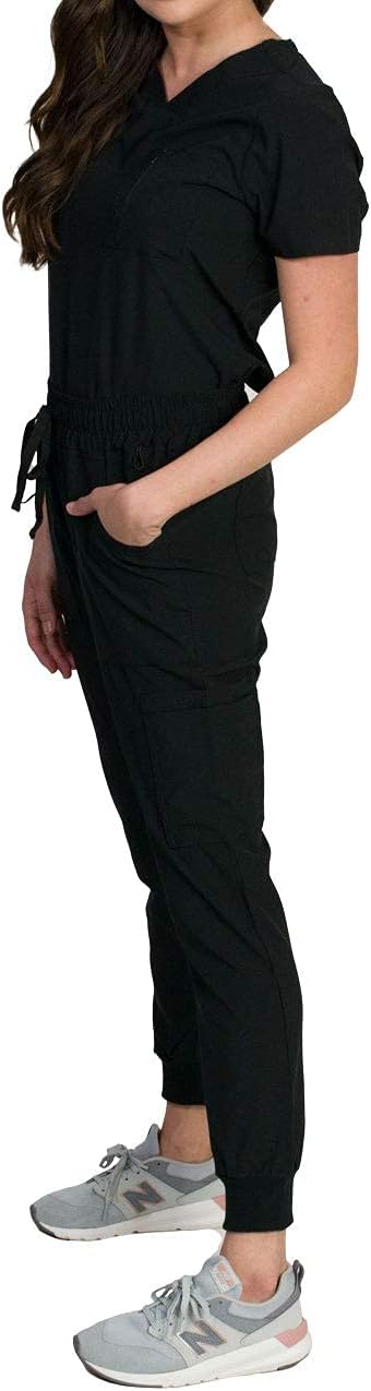 Scrubs top with 3 functional pockets, 1 pouch pocket on chest with zipper closure and 2 bottom front welt pockets. Elegant mitered V-neckline and Darted back. Slim tailored fit with Side-slit hem. Scrubs pants with 8 functional pockets, 2 round inset front pockets, 4 cargo side pockets, 2 back patch pockets and Bungee cord loop. Slim joggers fit with Knit rib cuffs hem and Elastic waistband with adjustable drawstrings.